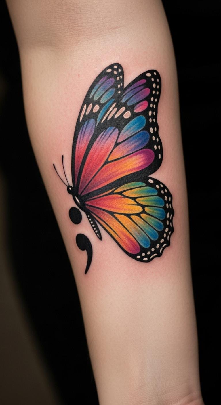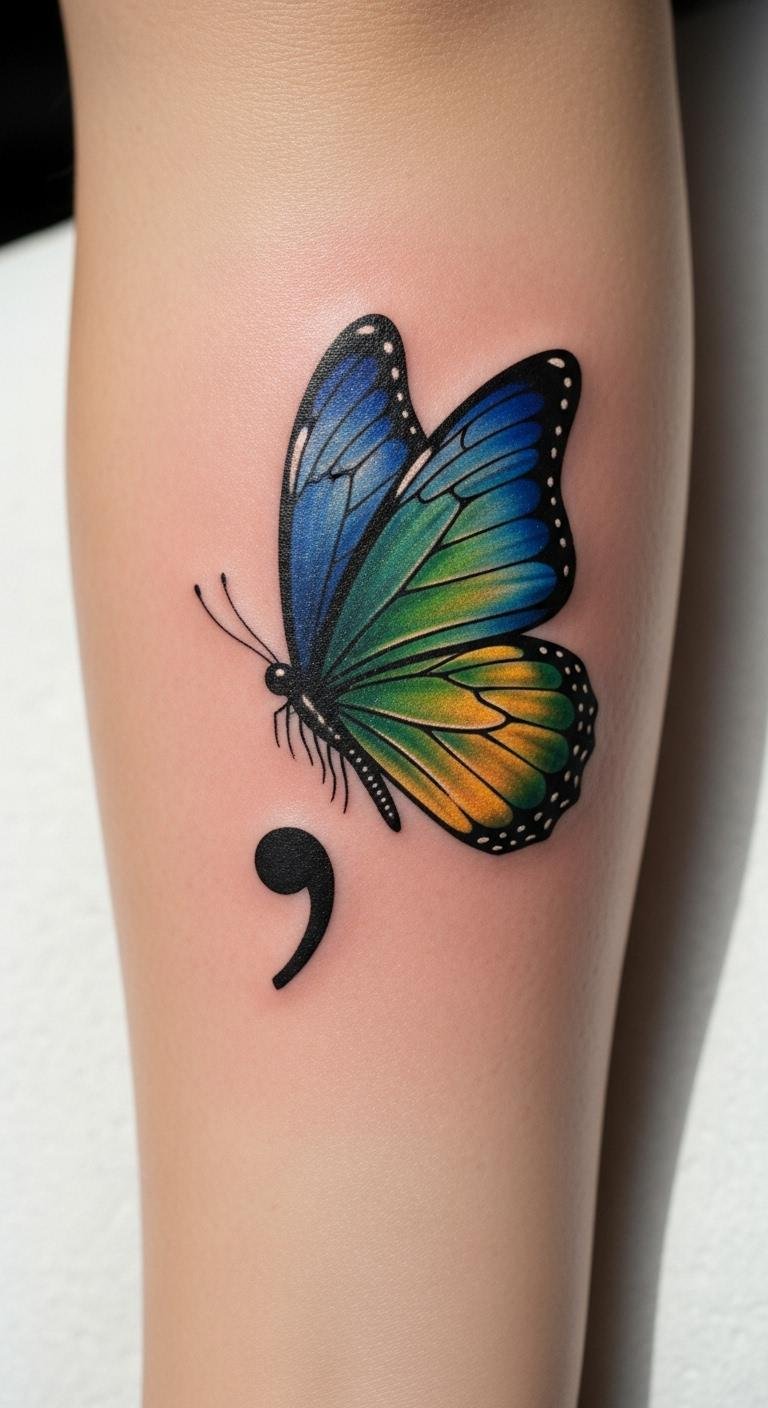 The semicolon butterfly tattoo embodies the journey of resilience and healing, serving as a reminder of personal struggles and triumphs.