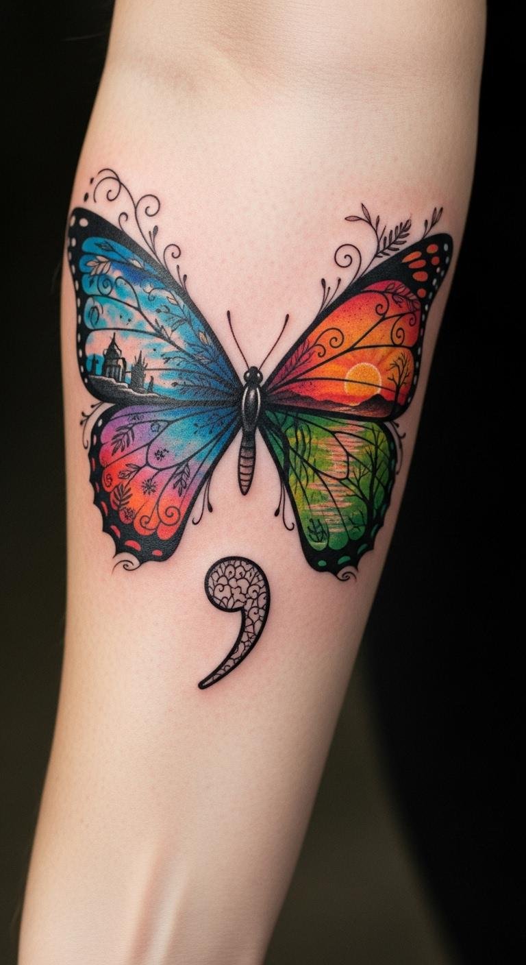 In this tattoo design, the semicolon butterfly represents a journey of transformation and hope. The vibrant colors convey the emotional spectrum one experiences, while the floral elements signify personal growth and renewal.