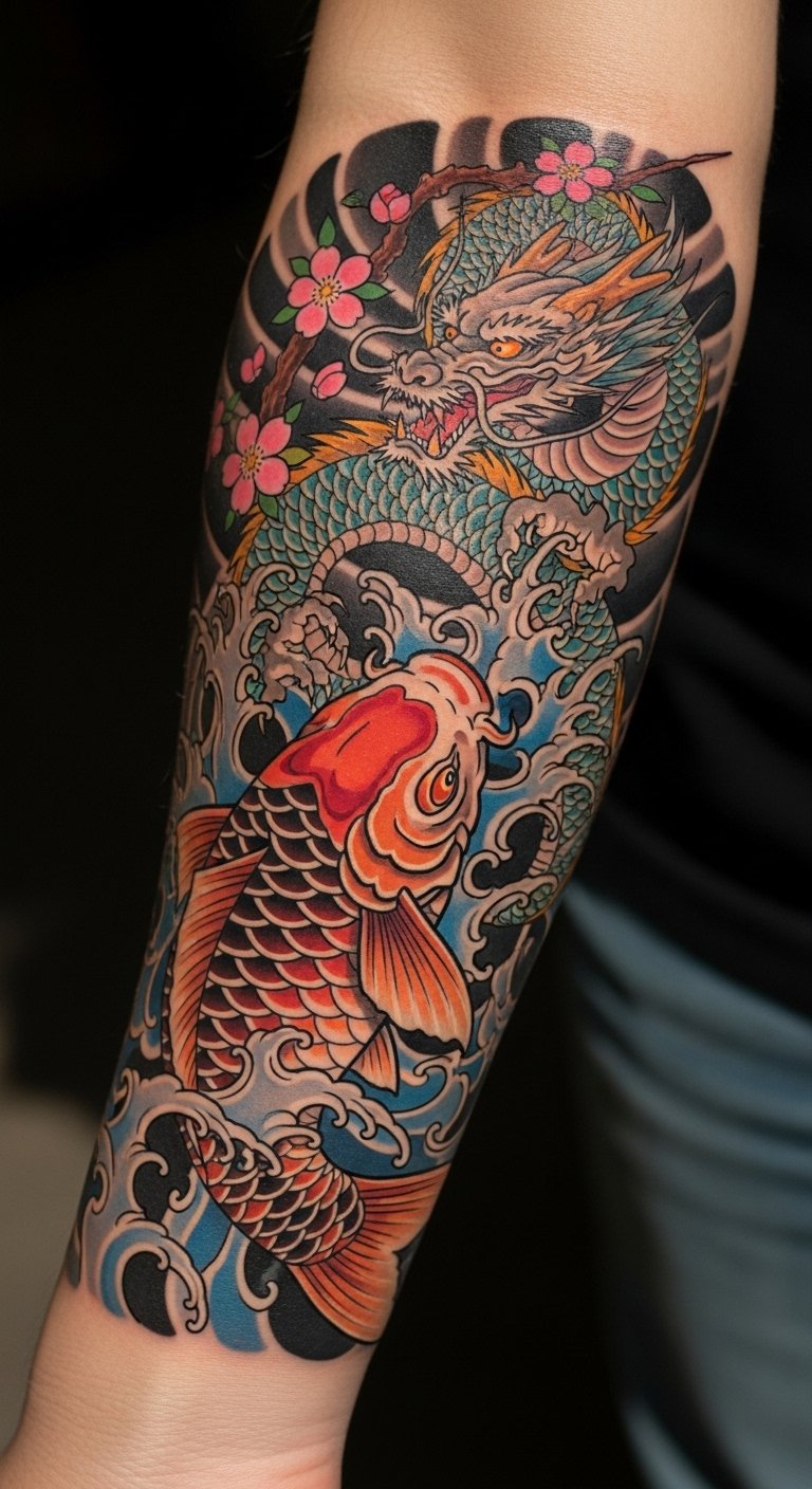This tattoo symbolizes perseverance and strength, as the koi fish is known for its journey against currents, representing determination and personal growth.