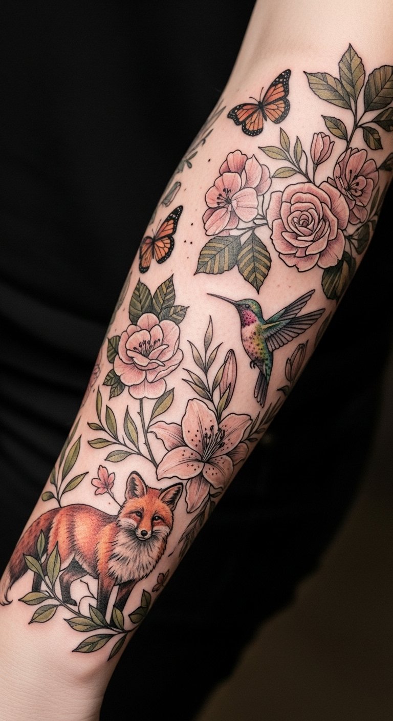 This tattoo serves as a powerful reminder of the beauty and diversity of the natural world. The botanical illustrations symbolize growth and renewal, while the wildlife motifs represent freedom and the interconnectedness of life.