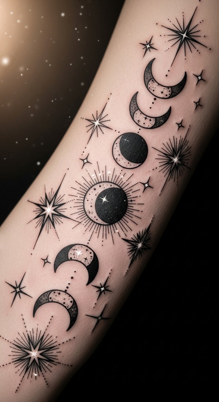 Celestial-Themed Tattoo With Stars and Moons