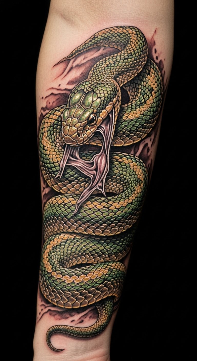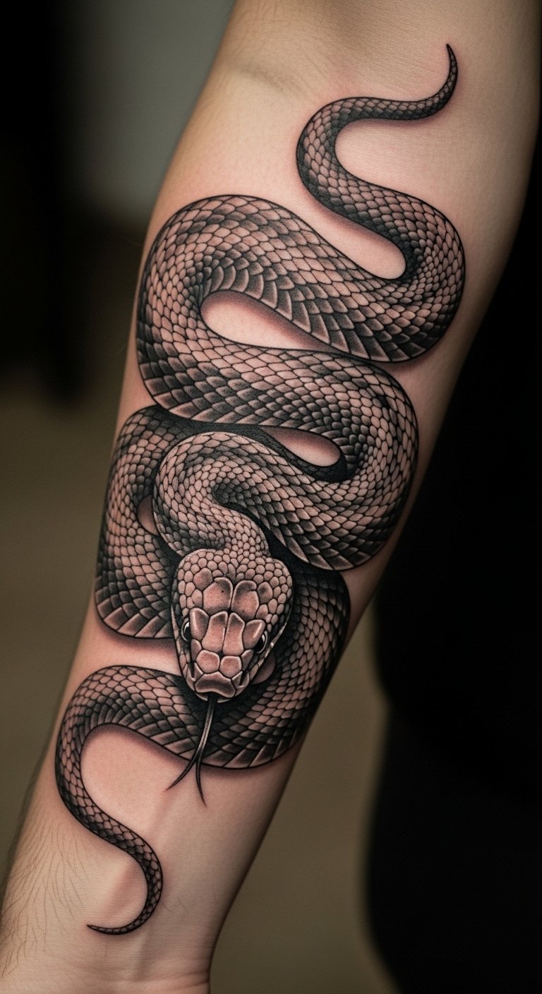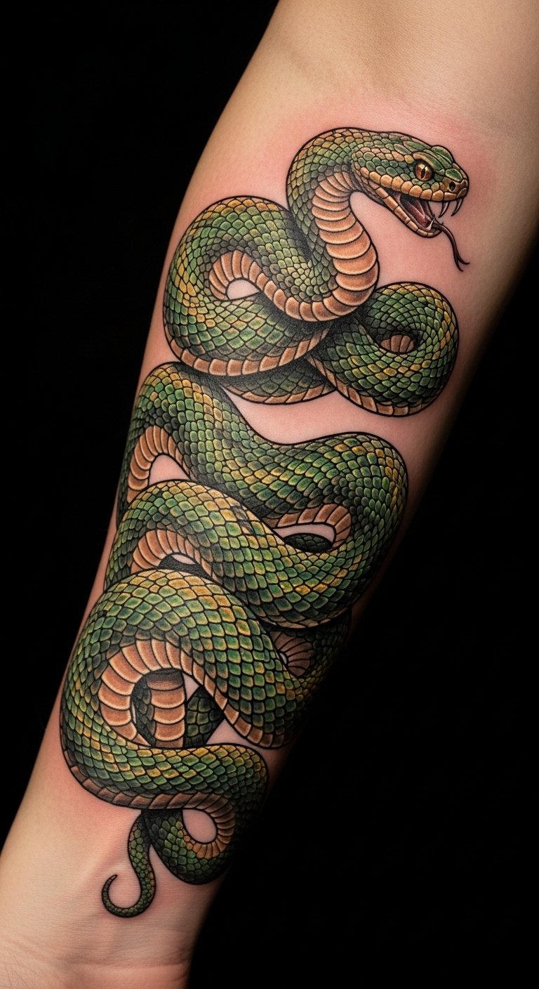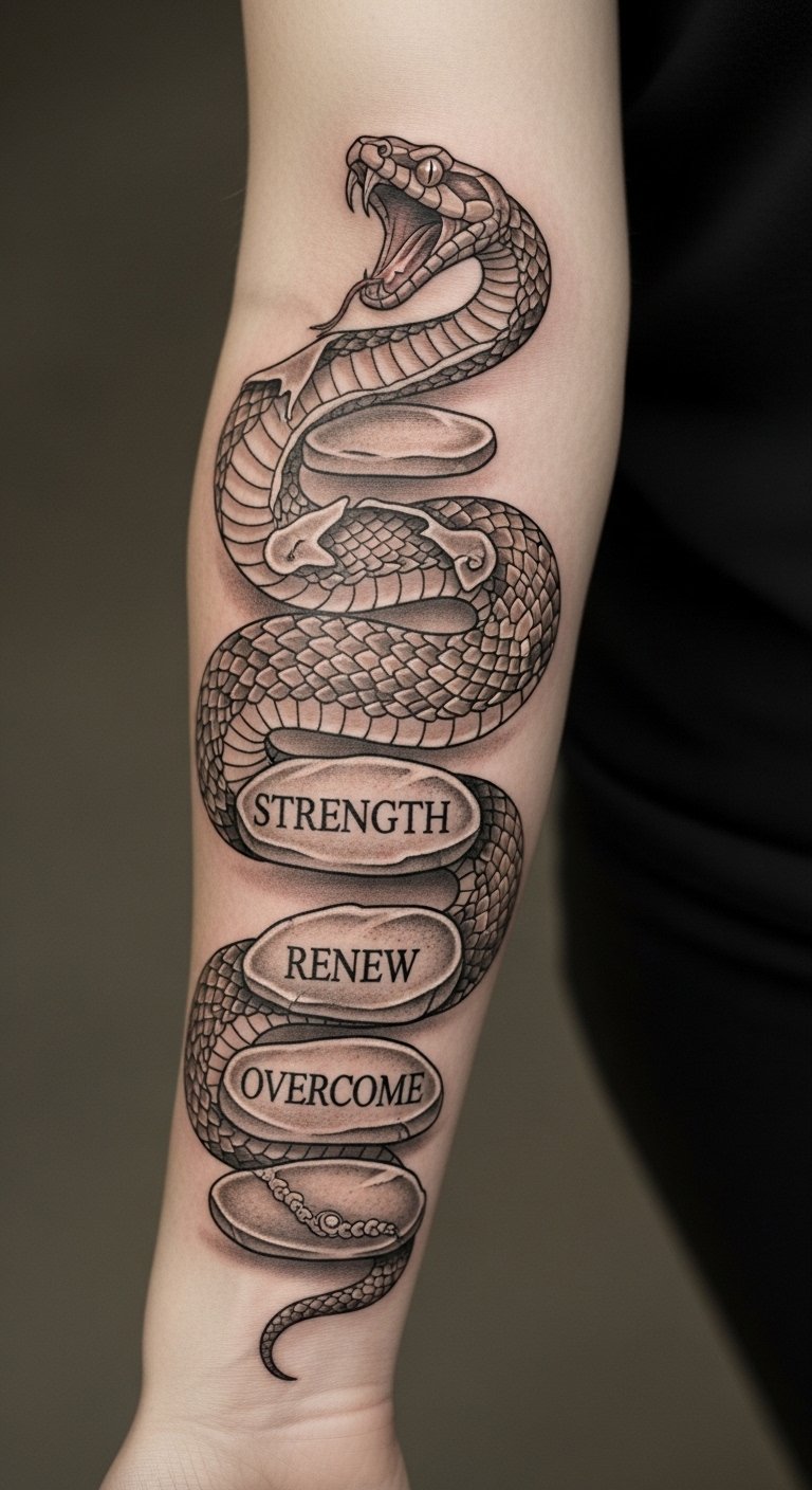 This striking snake tattoo on the forearm serves as a powerful emblem of resilience and renewal.