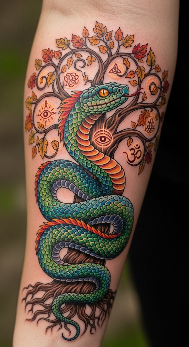 The tattoo symbolizes the deep connection between fertility and life force, embodying the snake’s role as a powerful emblem of rebirth and empowerment.