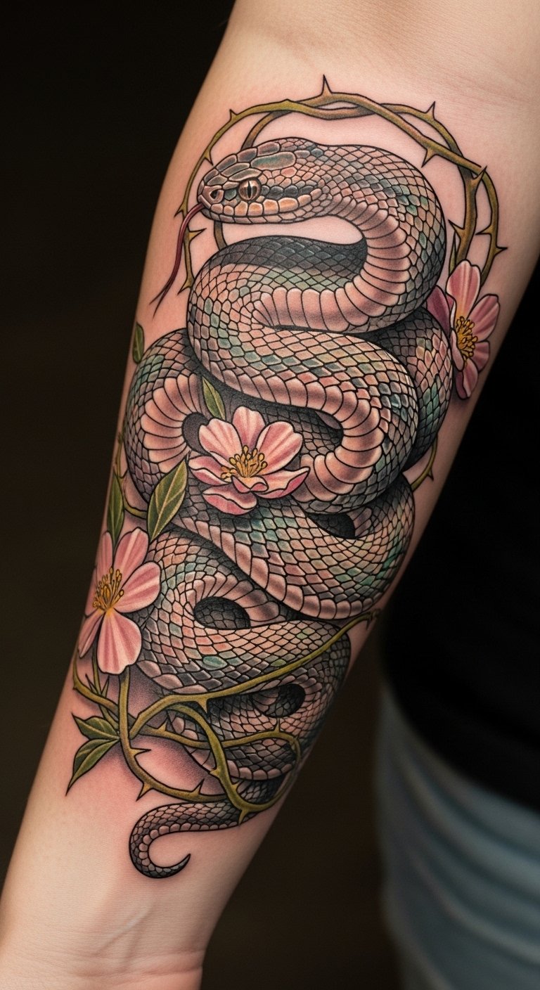 The vibrant scales and intertwining flowers convey beauty and allure, evoking a sense of caution and awareness, making it a powerful emblem of navigating life’s treacherous paths with courage.