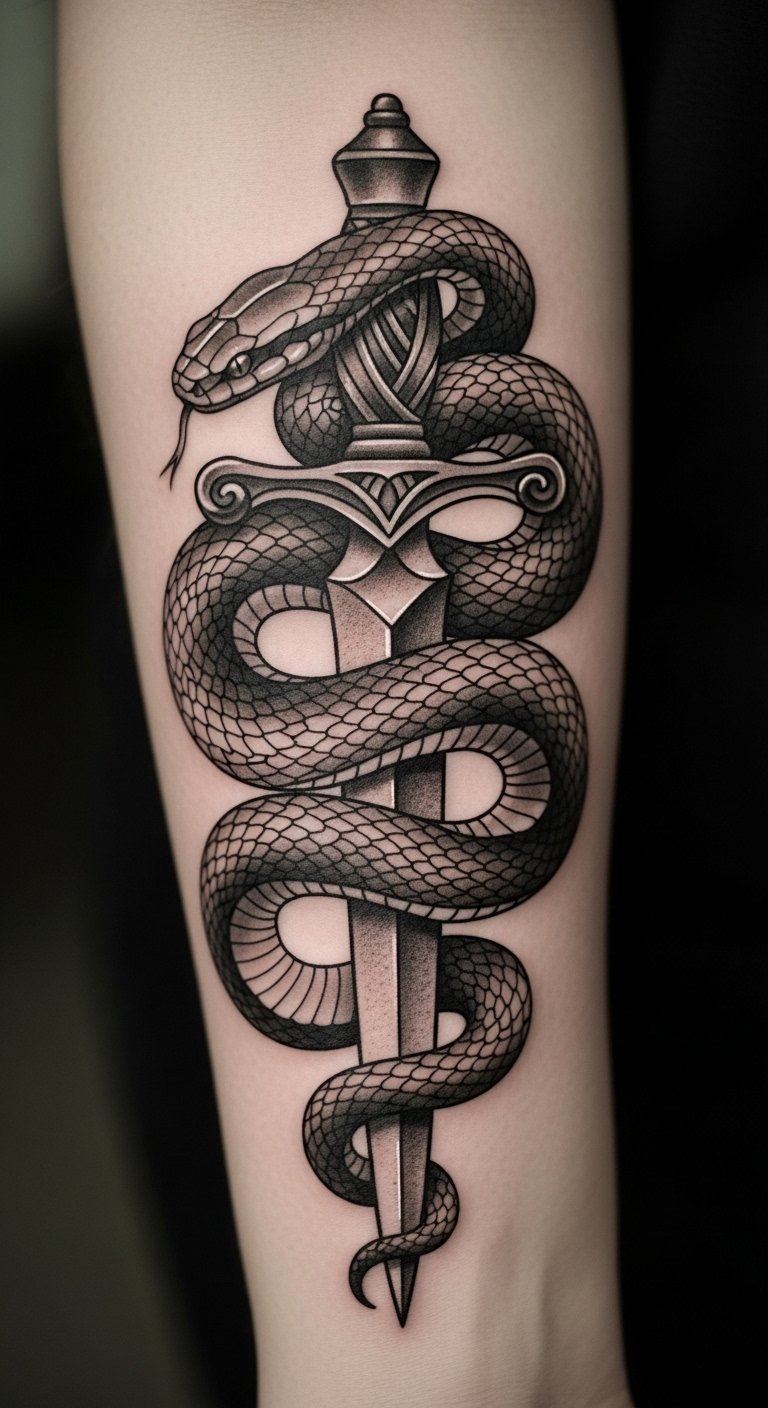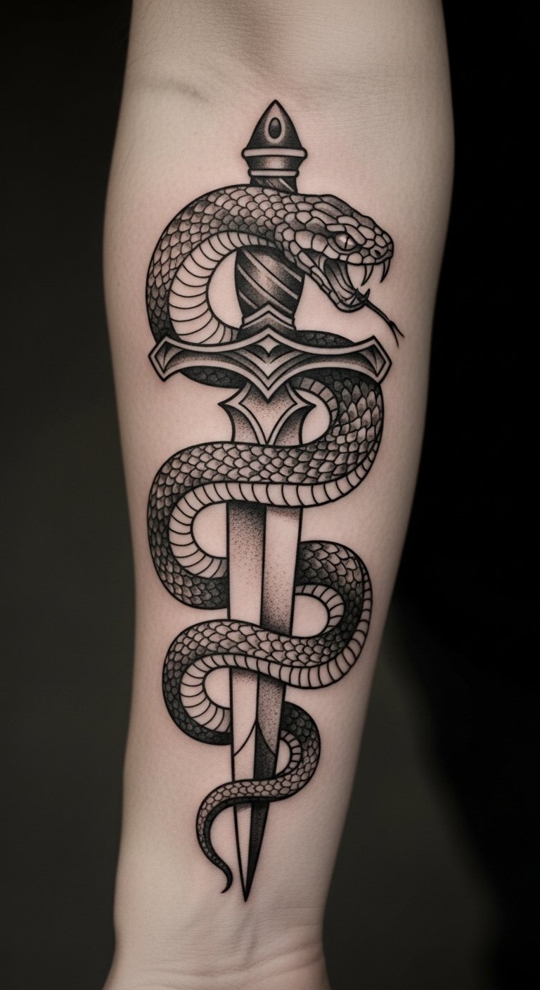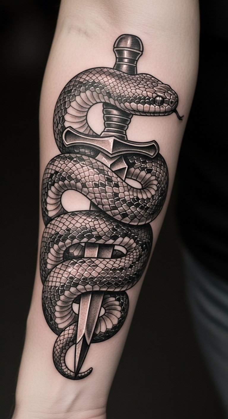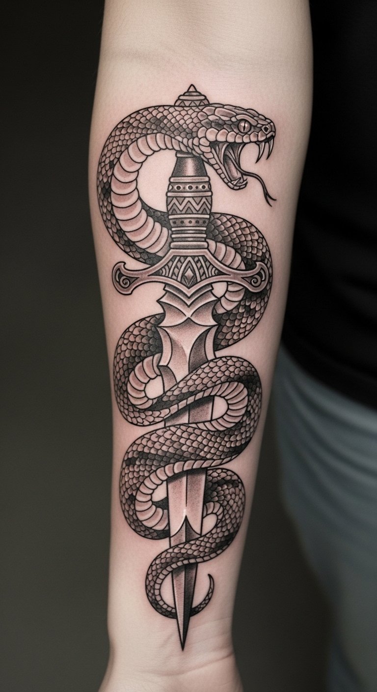 This tattoo symbolizes transformation and resilience, embodying the strength to overcome adversity. The snake represents rebirth and wisdom, while the dagger signifies protection and the courage to face challenges. Placed on the forearm, it serves as a constant reminder of personal empowerment, allowing the wearer to openly share their journey of strength and survival with the world. The visibility of this tattoo invites conversations about its profound meaning, making it not only a personal emblem but also a source of inspiration for others.