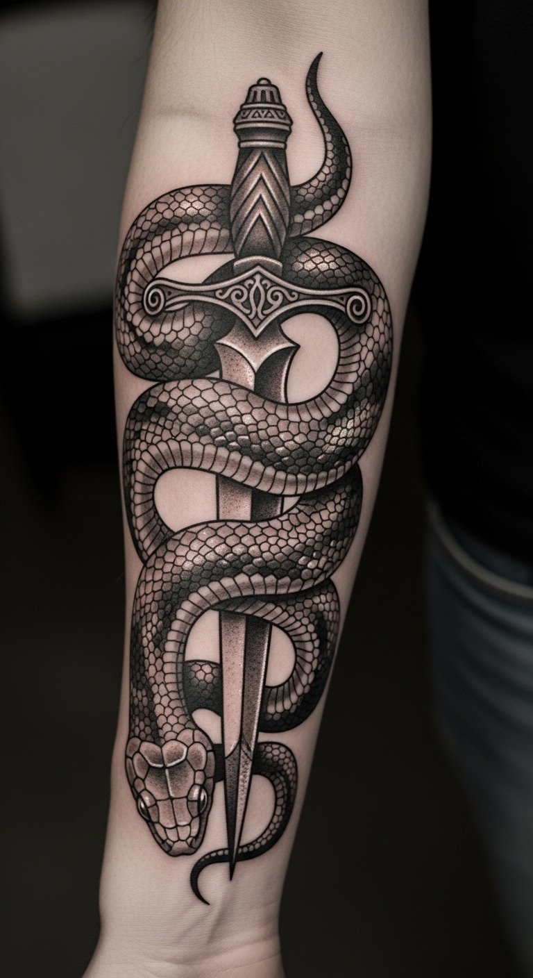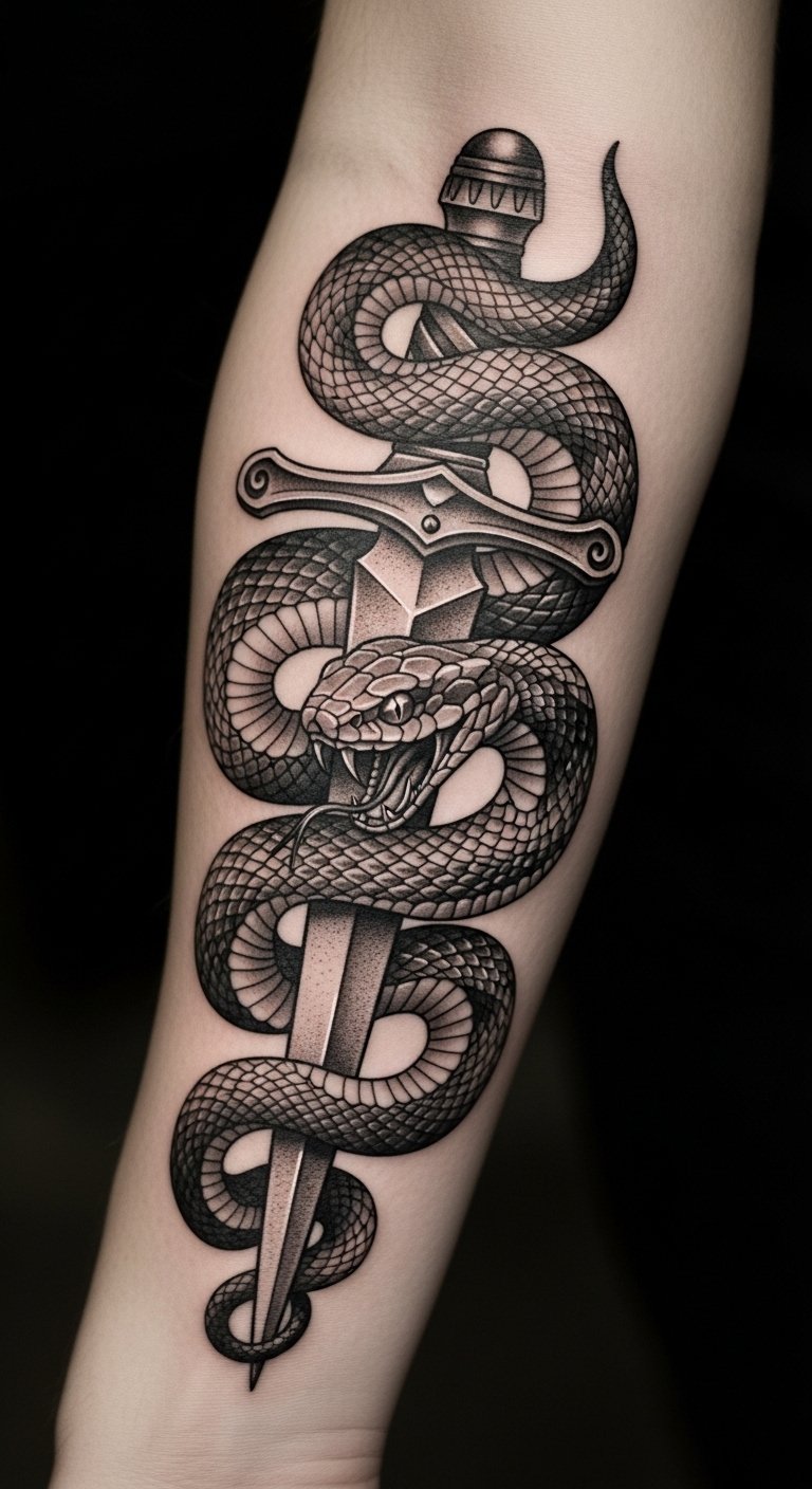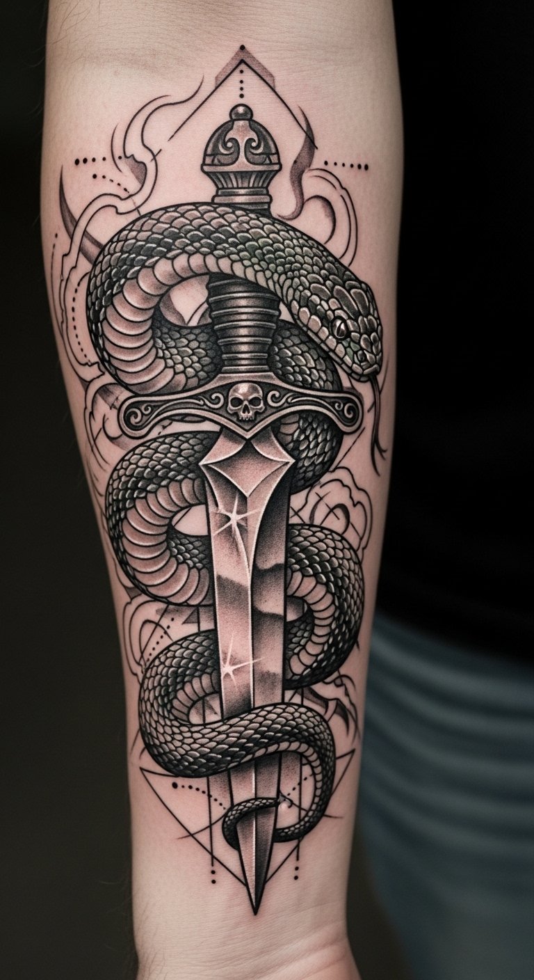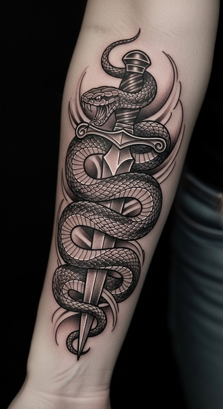 This tattoo symbolizes transformation and resilience, embodying the strength to overcome adversity. The snake represents rebirth and wisdom, while the dagger signifies protection and the courage to face challenges. Placed on the forearm, it serves as a constant reminder of personal empowerment, allowing the wearer to openly share their journey of strength and survival with the world. The visibility of this tattoo invites conversations about its profound meaning, making it not only a personal emblem but also a source of inspiration for others.