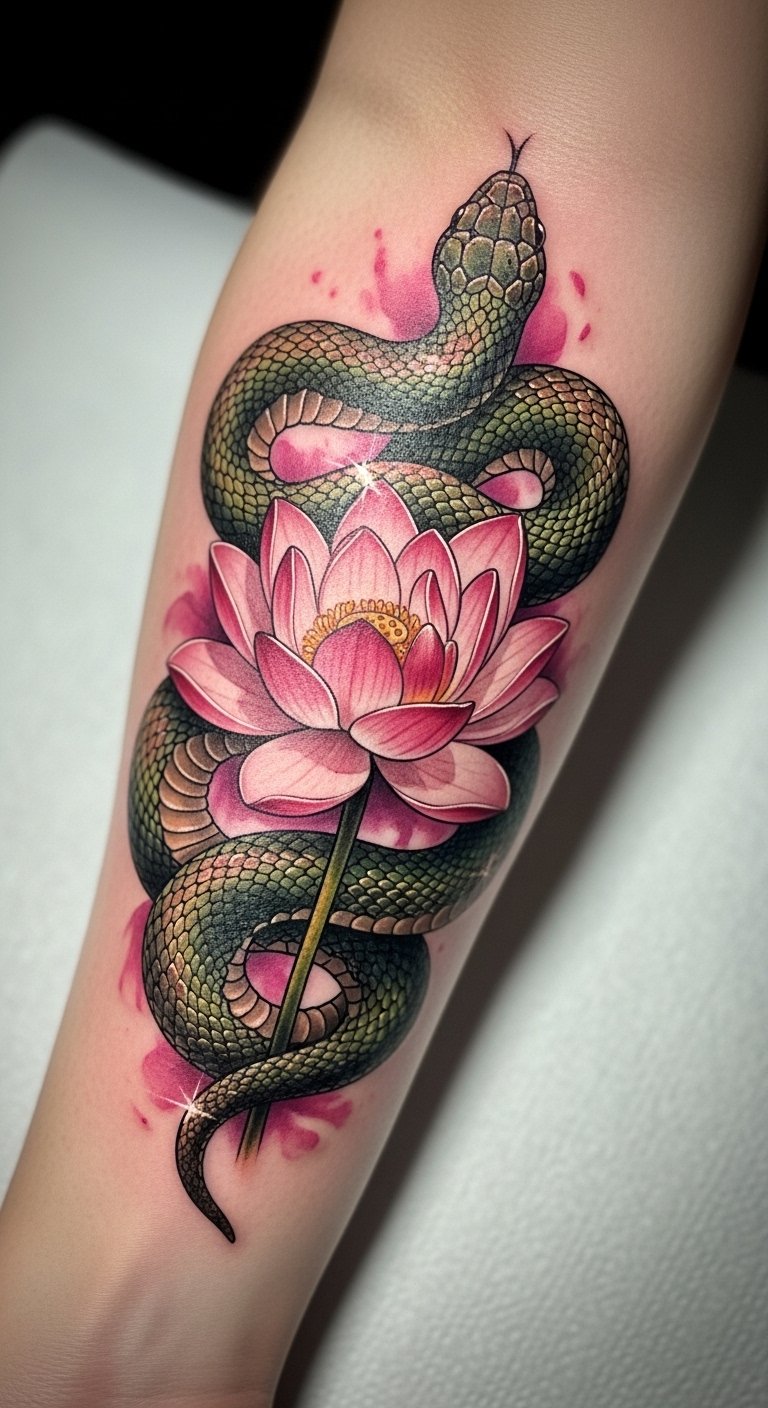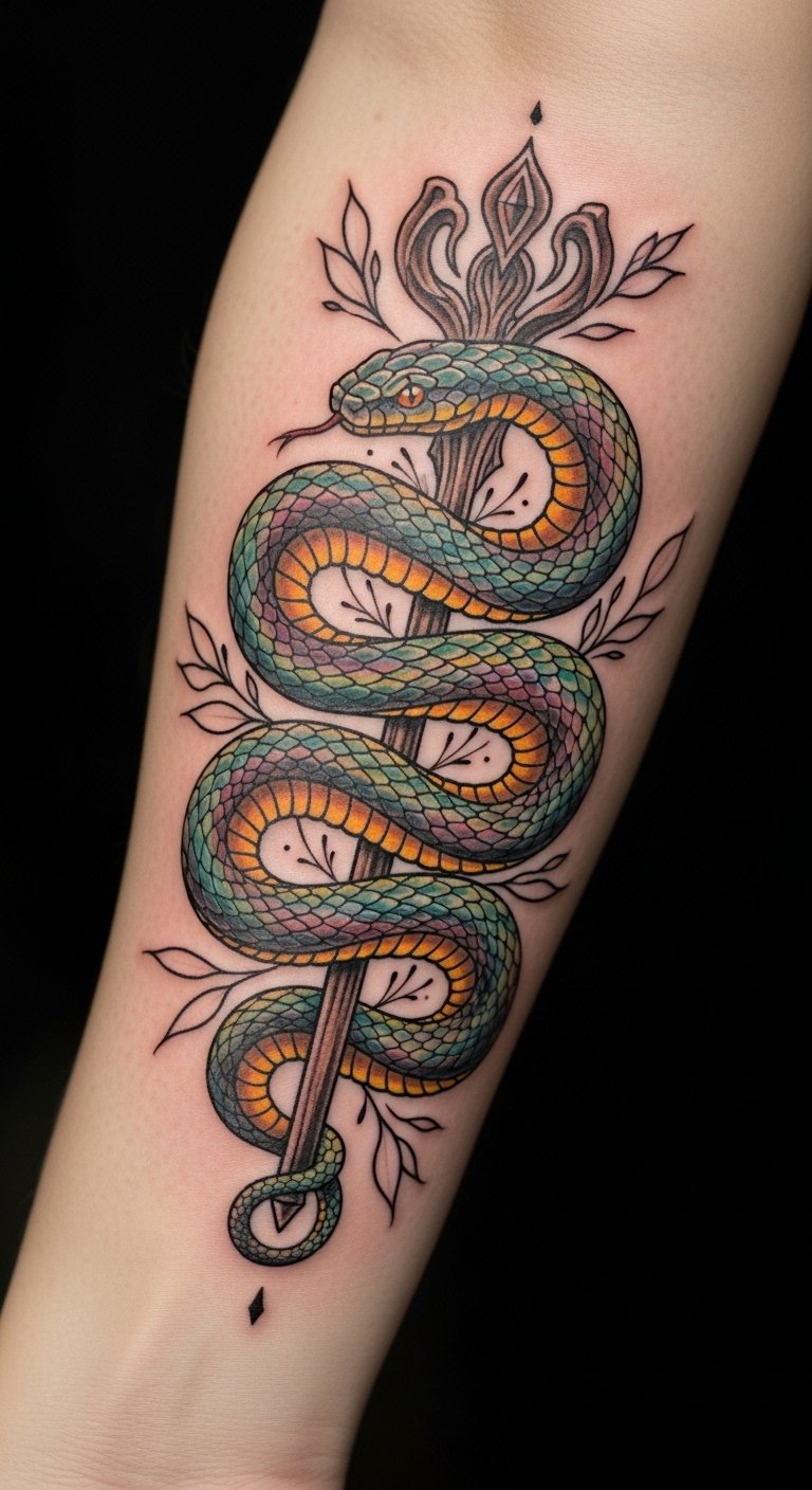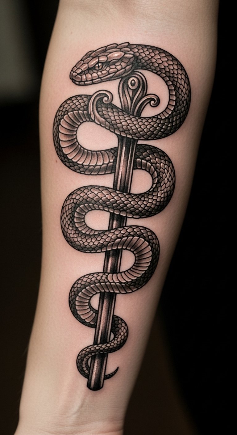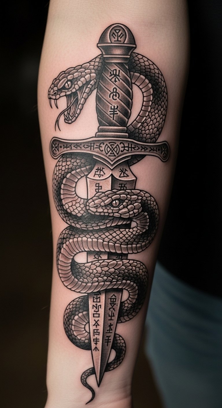 This tattoo symbolizes transformation and resilience, embodying the strength to overcome adversity. The snake represents rebirth and wisdom, while the dagger signifies protection and the courage to face challenges. Placed on the forearm, it serves as a constant reminder of personal empowerment, allowing the wearer to openly share their journey of strength and survival with the world. The visibility of this tattoo invites conversations about its profound meaning, making it not only a personal emblem but also a source of inspiration for others.