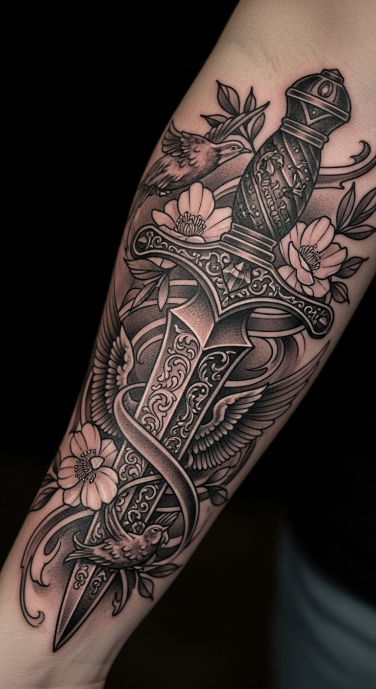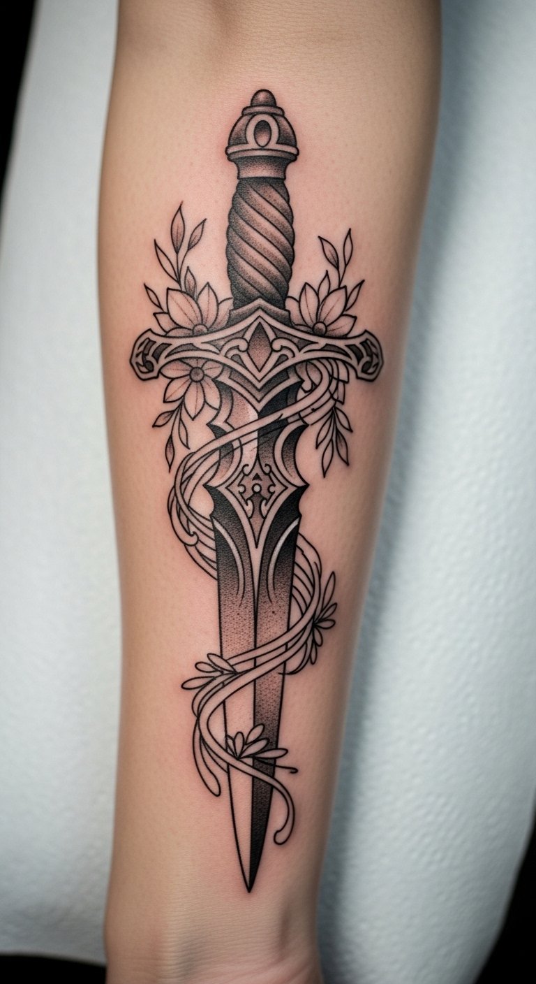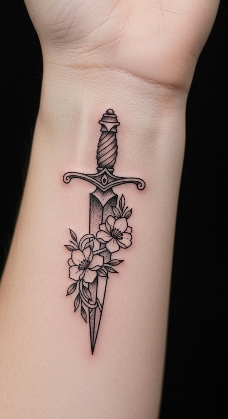The dagger signifies protection and power, while the floral elements introduce a sense of beauty and freedom.