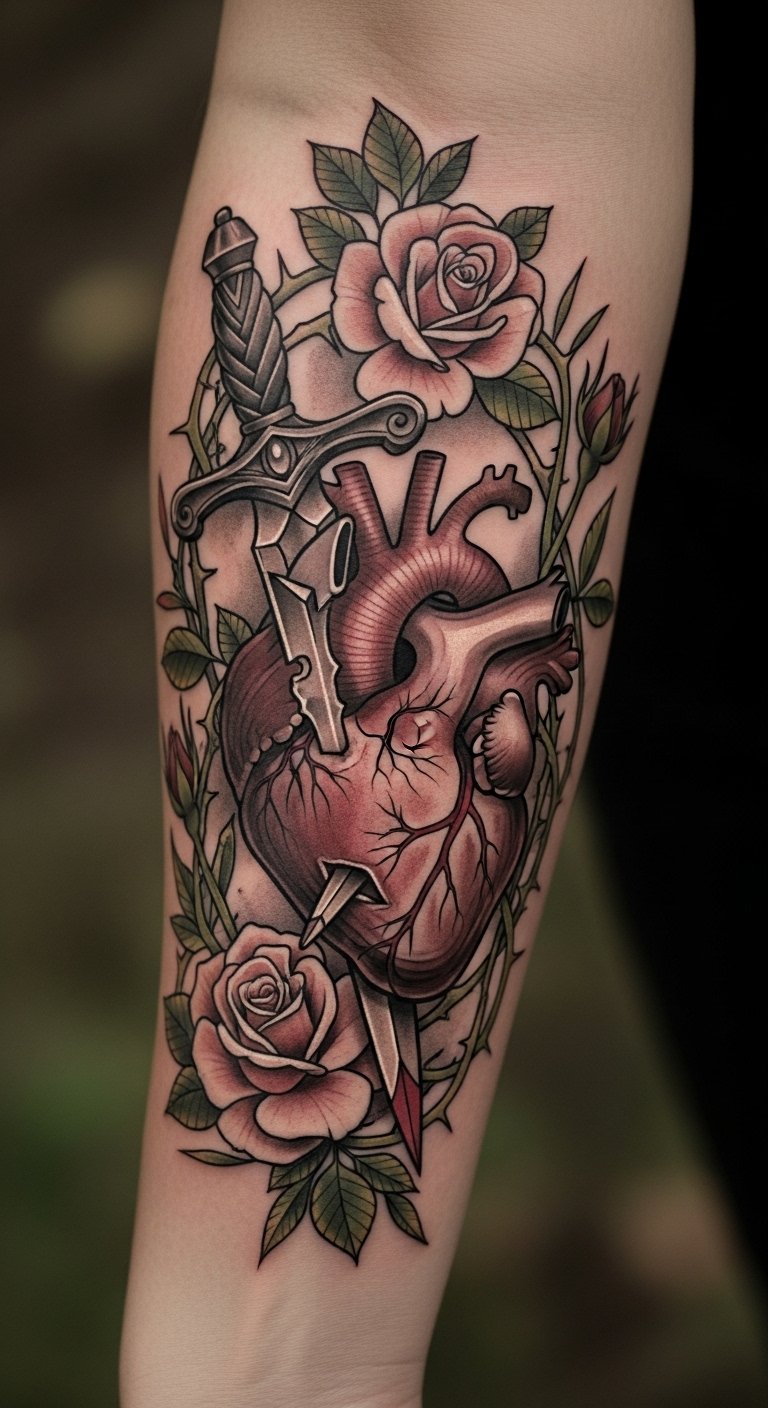 The heart represents love and vulnerability, while the dagger signifies the piercing hurt that often accompanies deep connections. The surrounding roses add beauty and a reminder of growth through adversity.