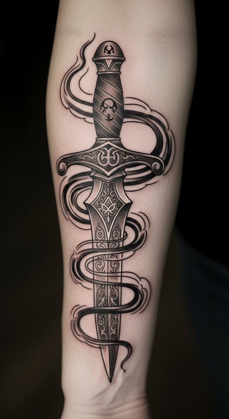This dagger tattoo serves as a powerful emblem of inner strength and survival. Placed on the forearm, it remains visible, constantly reminding the wearer of their resilience and the journey they’ve undergone.