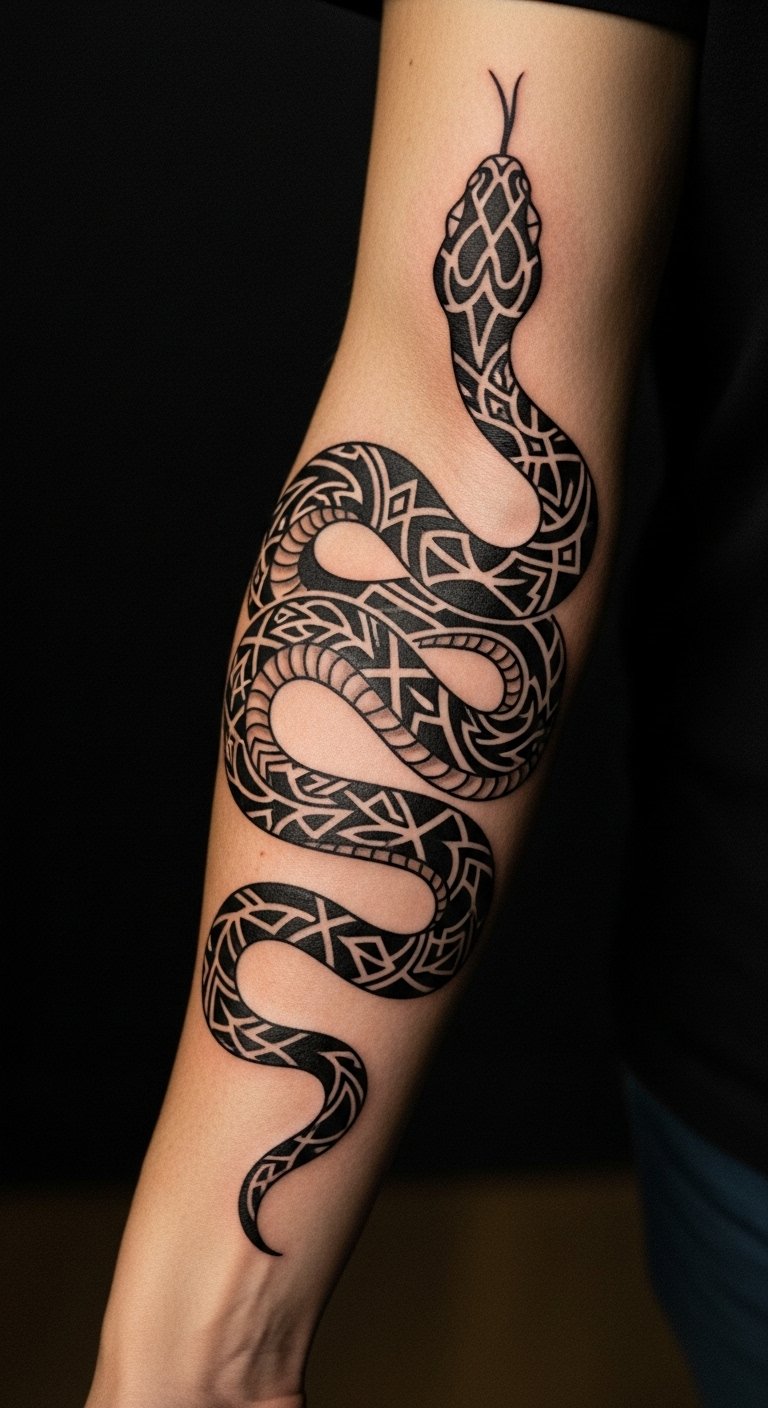 The tribal snake tattoo symbolizes primal energy and ancestral power, serving as a reminder of strength and resilience.