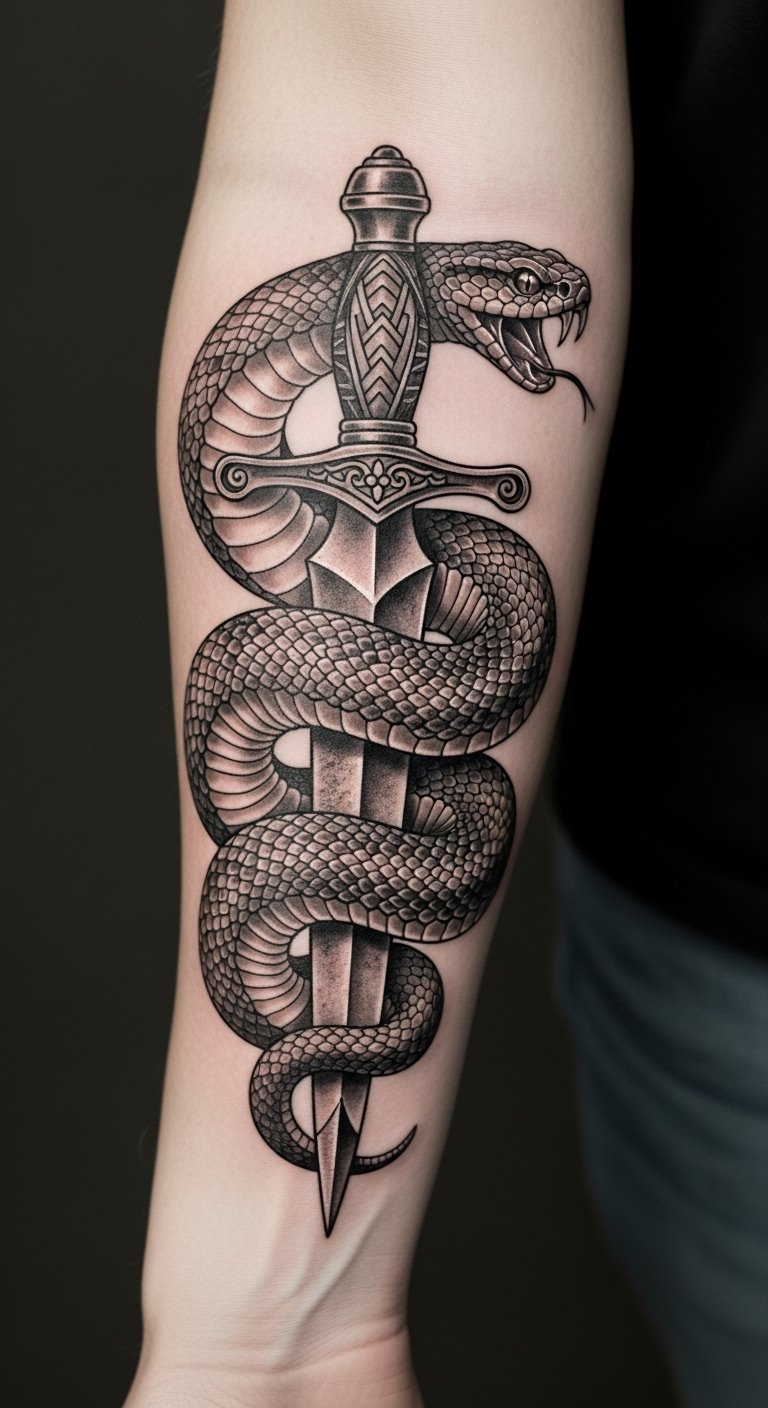 This tattoo symbolizes the duality of battle and triumph over adversity, with the snake representing resilience and the dagger signifying the fight against life’s challenges.