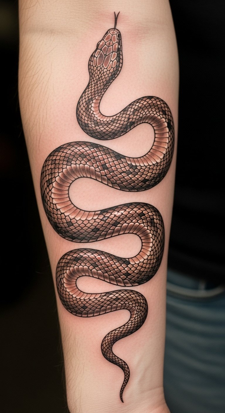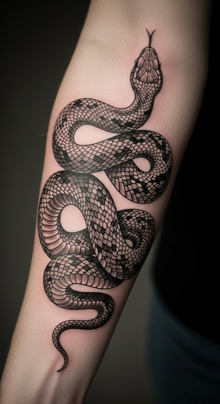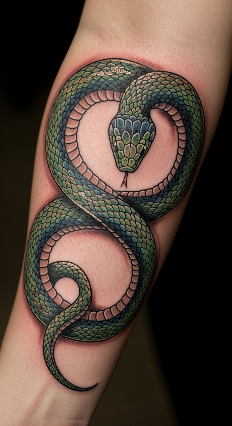The snake tattoo on the forearm embodies the essence of fertility and regeneration, reflecting life’s creative forces. Its placement on a visible area allows for personal expression while celebrating the cycles of life.