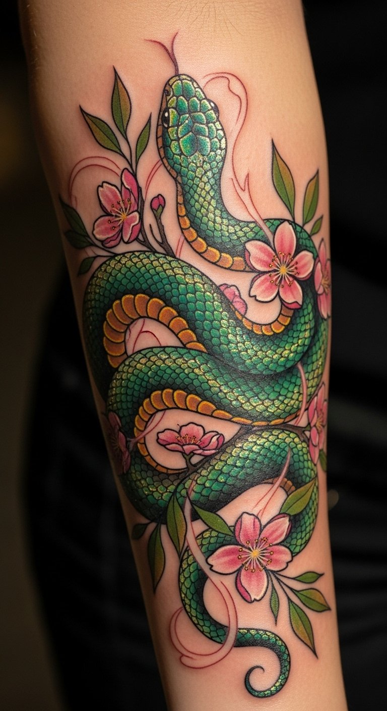 The snake tattoo symbolizes personal transformation and resilience, embodying the journey of growth through life’s challenges.
