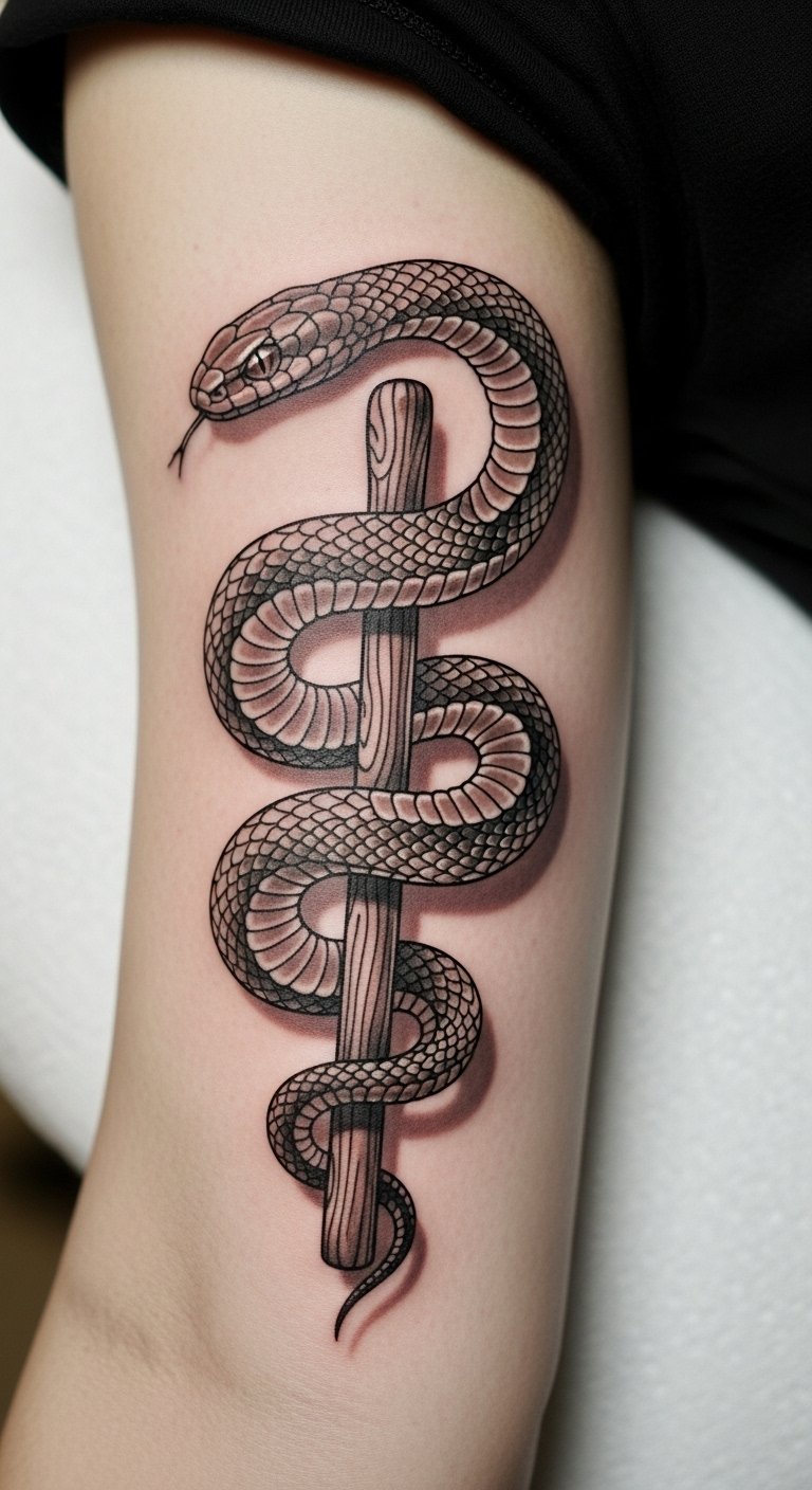 This tattoo embodies the duality of the snake as both a symbol of danger and wisdom, reflecting the complex moral dilemmas we face.