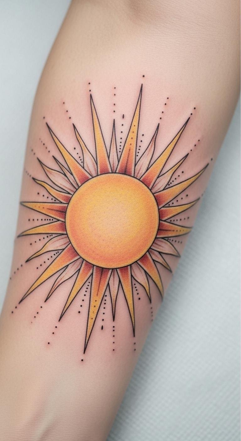 This sun tattoo on the forearm symbolizes life energy and renewal, making it a perfect placement for a design that radiates warmth and hope.