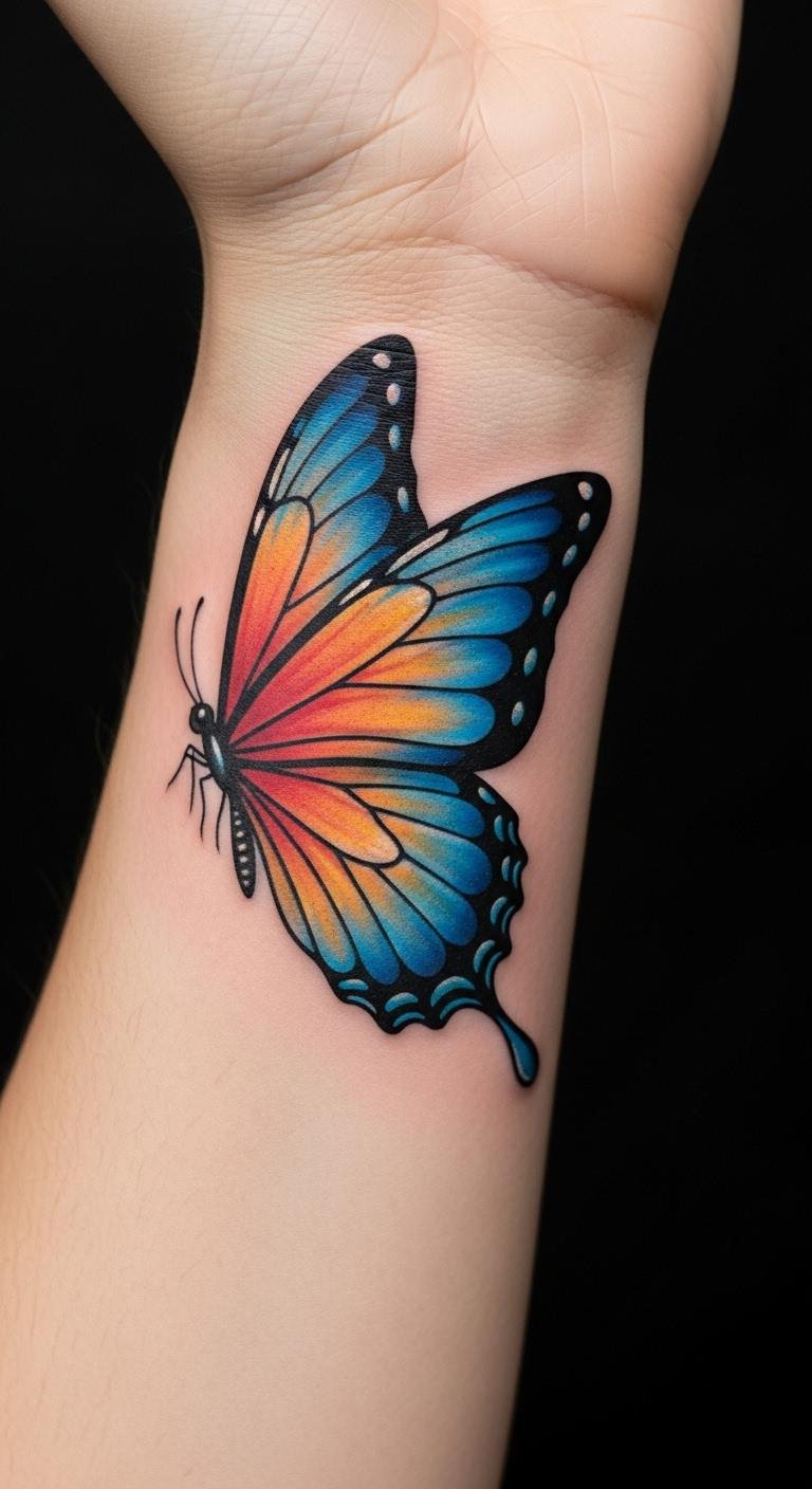The butterfly tattoo on the wrist symbolizes personal transformation and the freedom to embrace change.