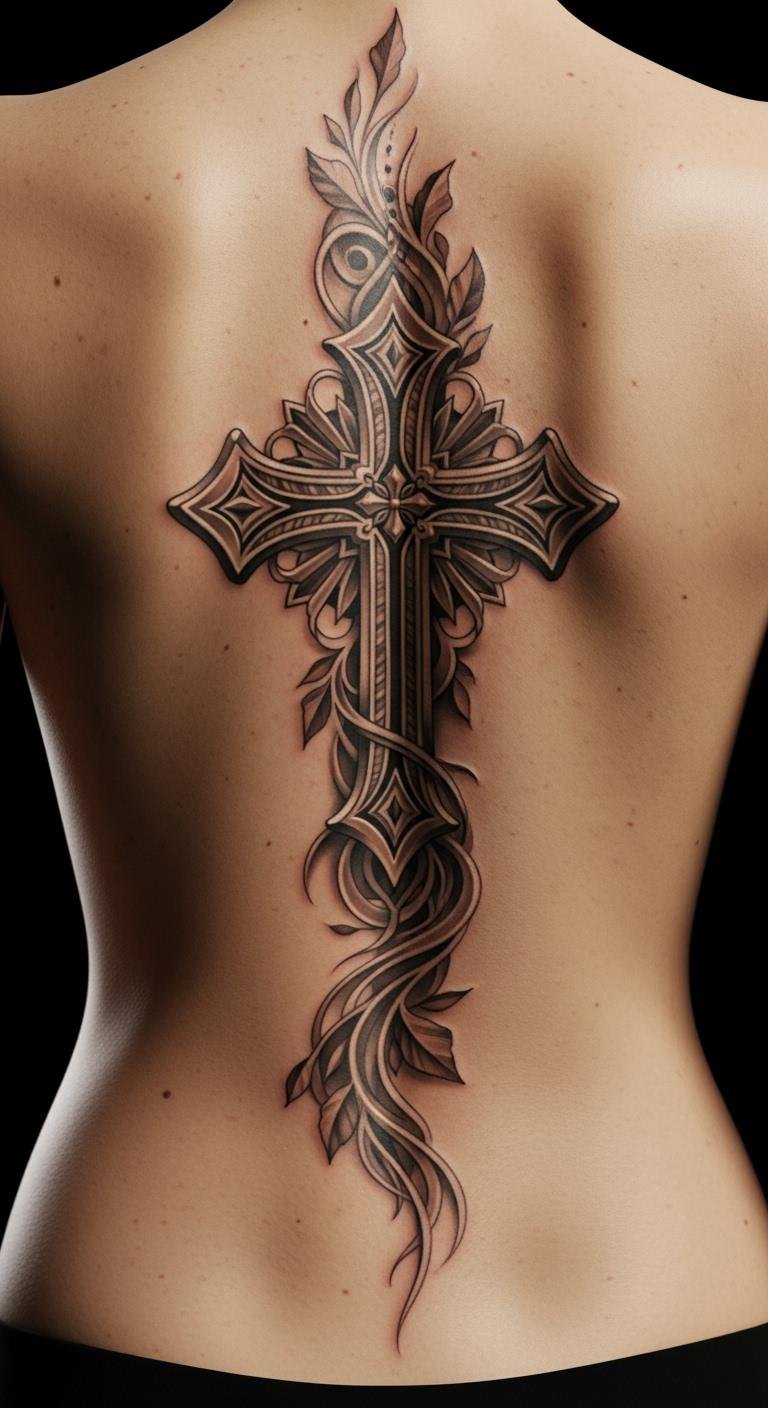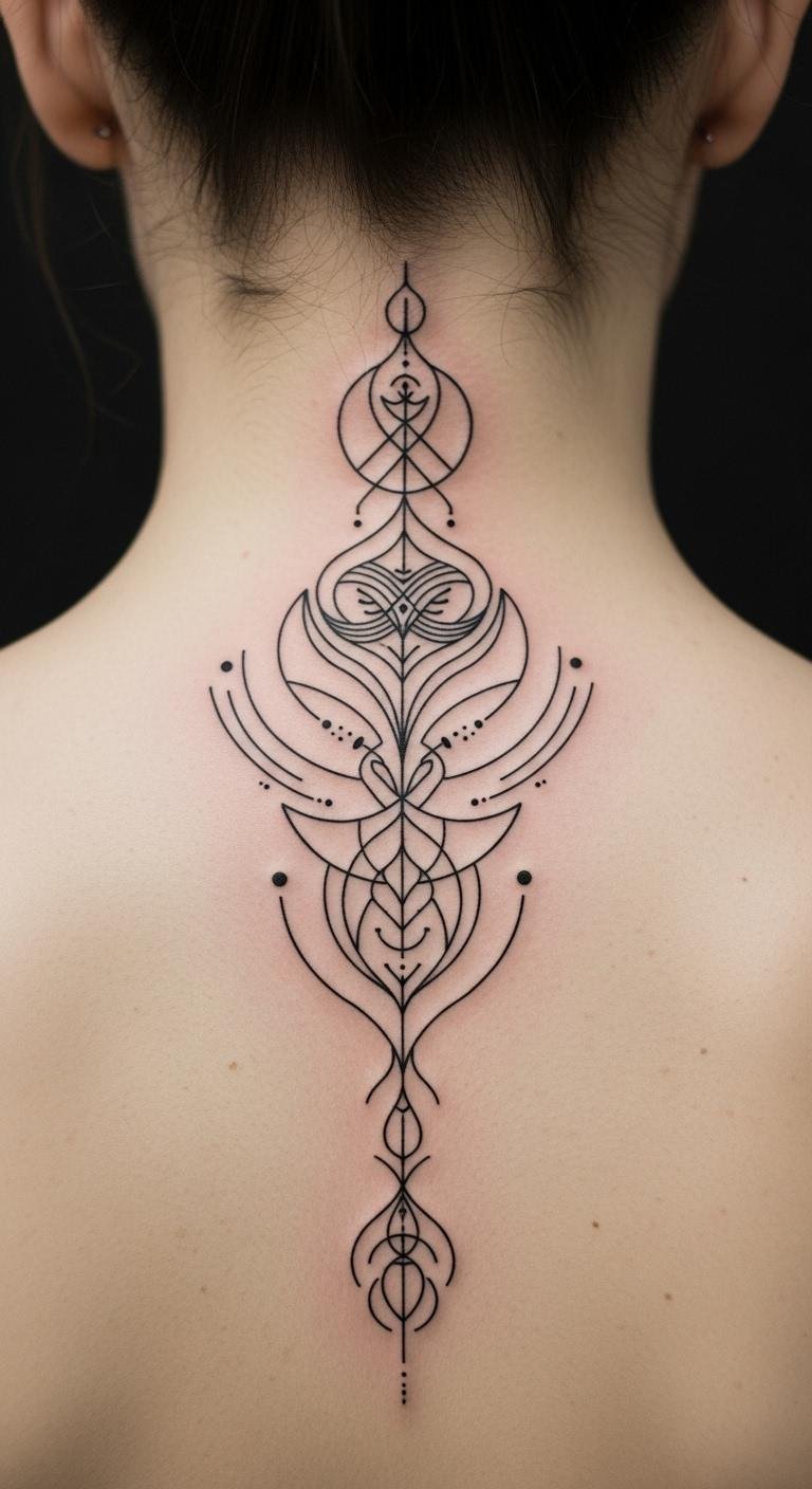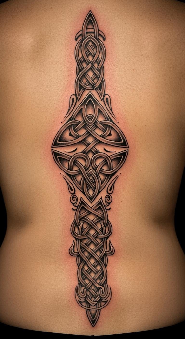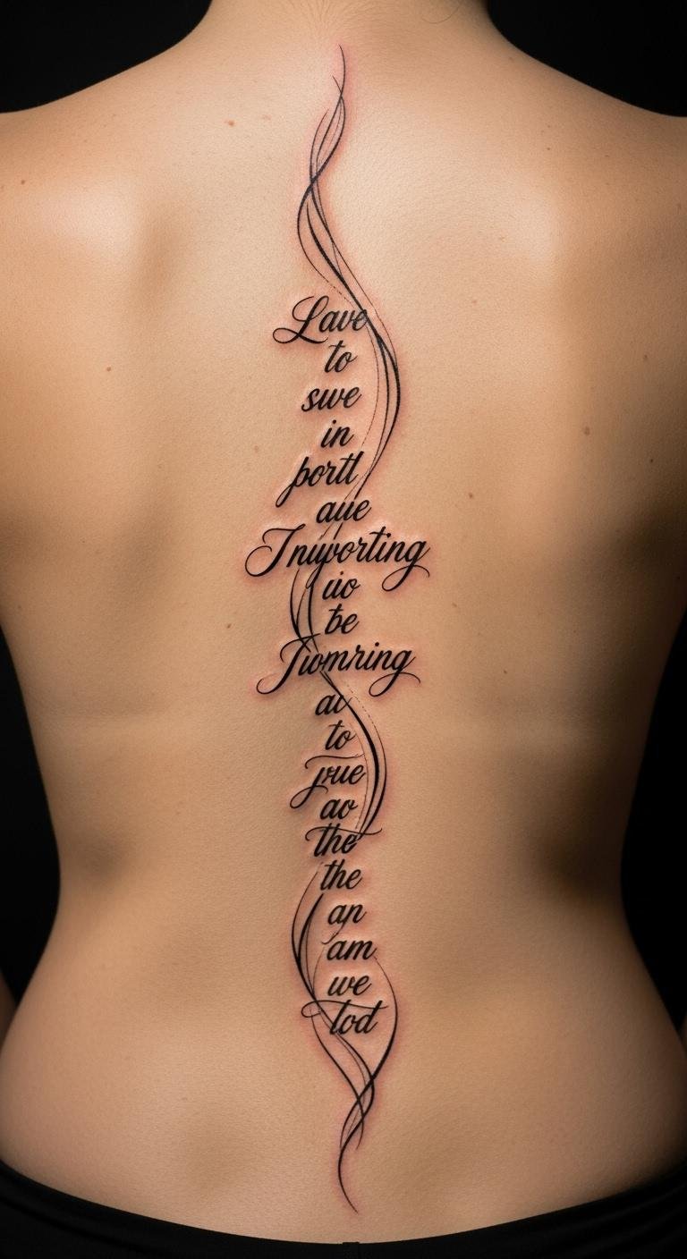 The placement along the spine not only accentuates the body’s natural curves but also serves as a reminder of strength and resilience.