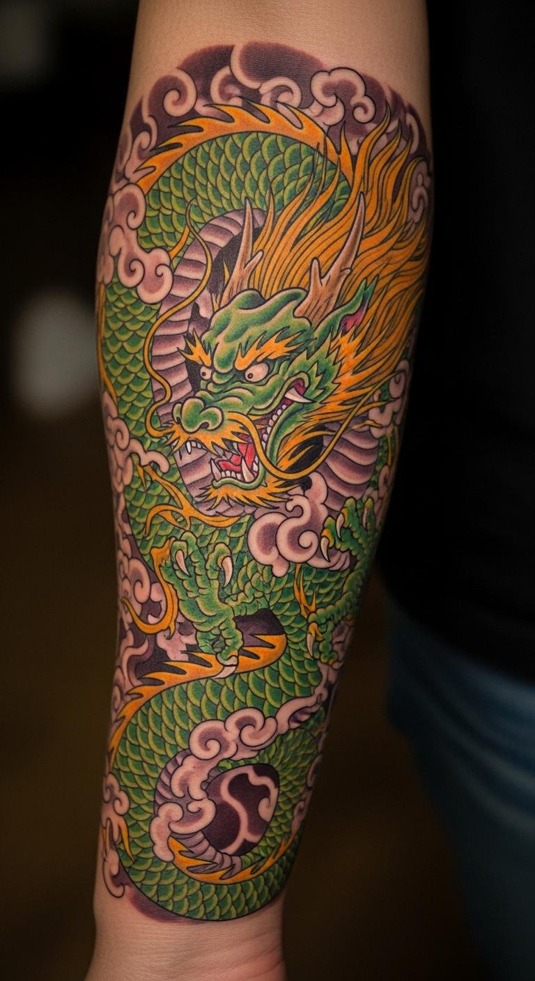 The dragon tattoo on the forearm serves as a powerful emblem of strength and wisdom, resonating deeply with Eastern cultural symbolism.
