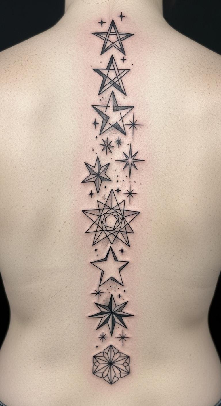 This tattoo design embodies the symbolism of stars as guiding lights in dark times. Positioned along the spine, it represents a powerful connection to one’s inner strength and aspirations.