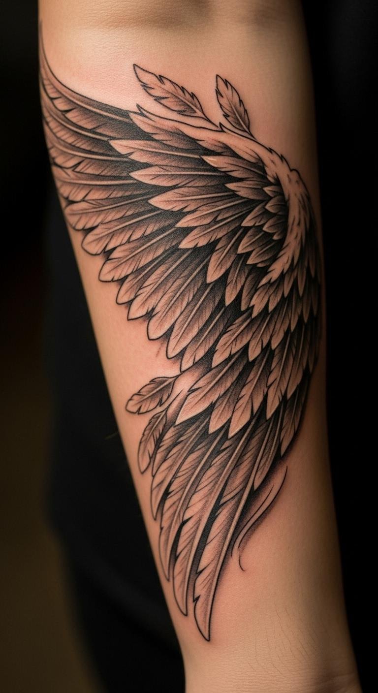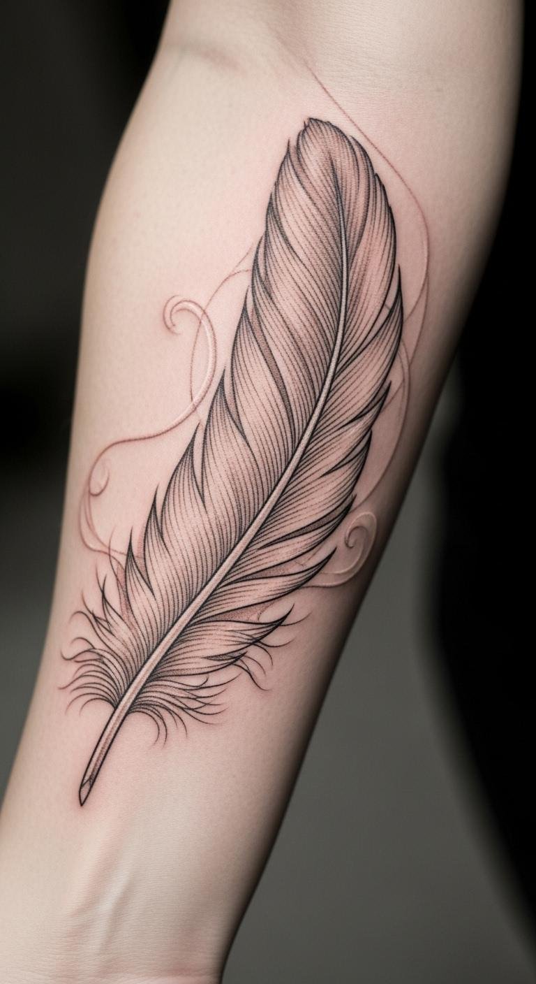 The feather tattoo prominently displayed on the forearm serves as a powerful symbol of freedom and transcendence.