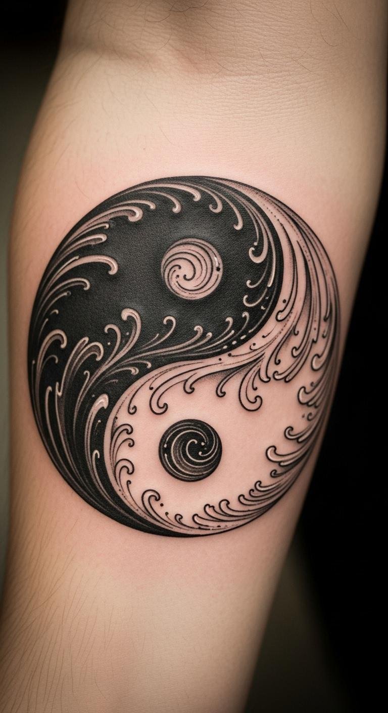 This yin-yang tattoo on the forearm symbolizes the delicate balance of opposing forces in life, serving as a constant reminder to embrace both light and dark.
