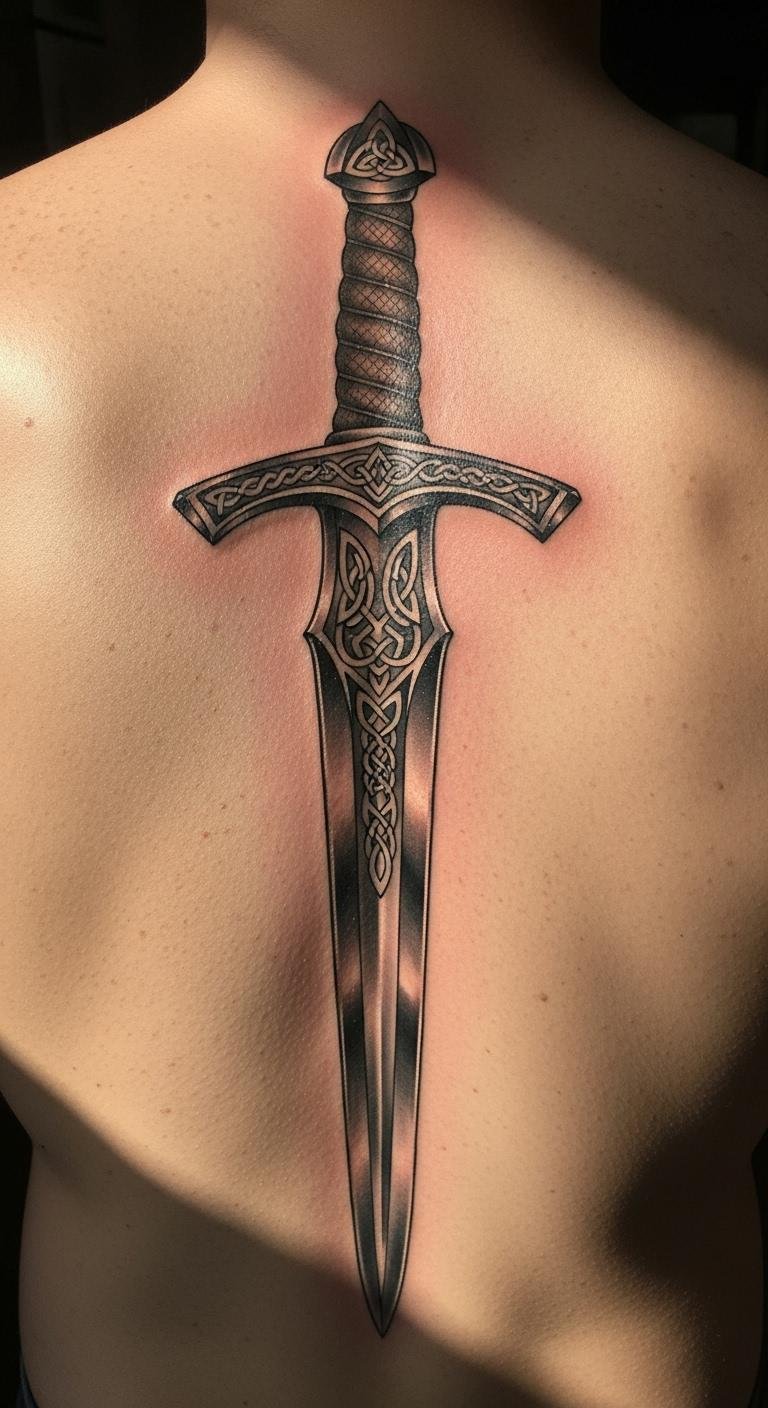 This sword tattoo represents a powerful declaration of strength and truth, perfectly placed along the spine to symbolize resilience and authenticity.