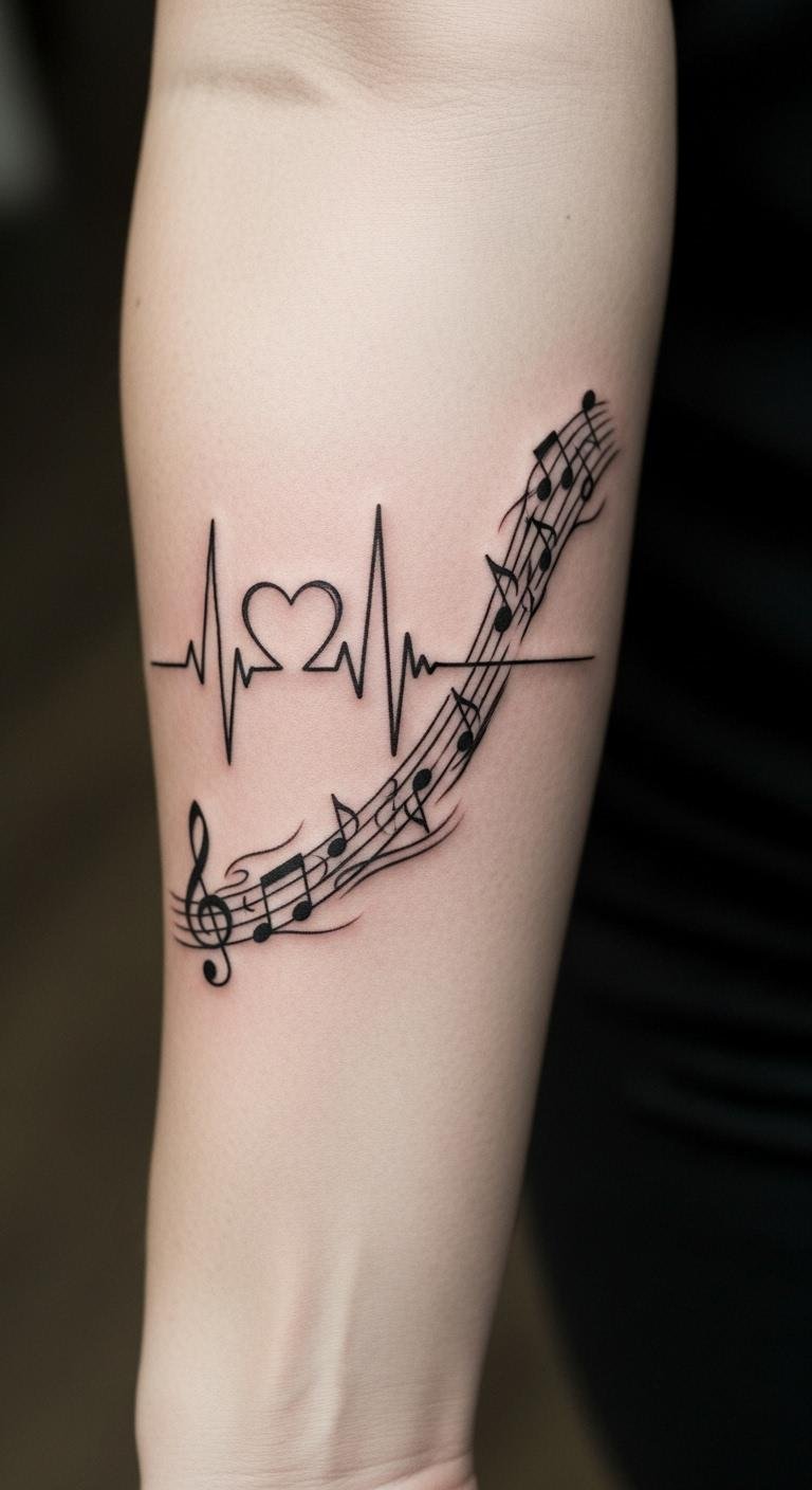 The interweaving of the heartbeat line and musical notes not only celebrates creativity and passion but also tells a unique story that’s deeply personal to the wearer.
