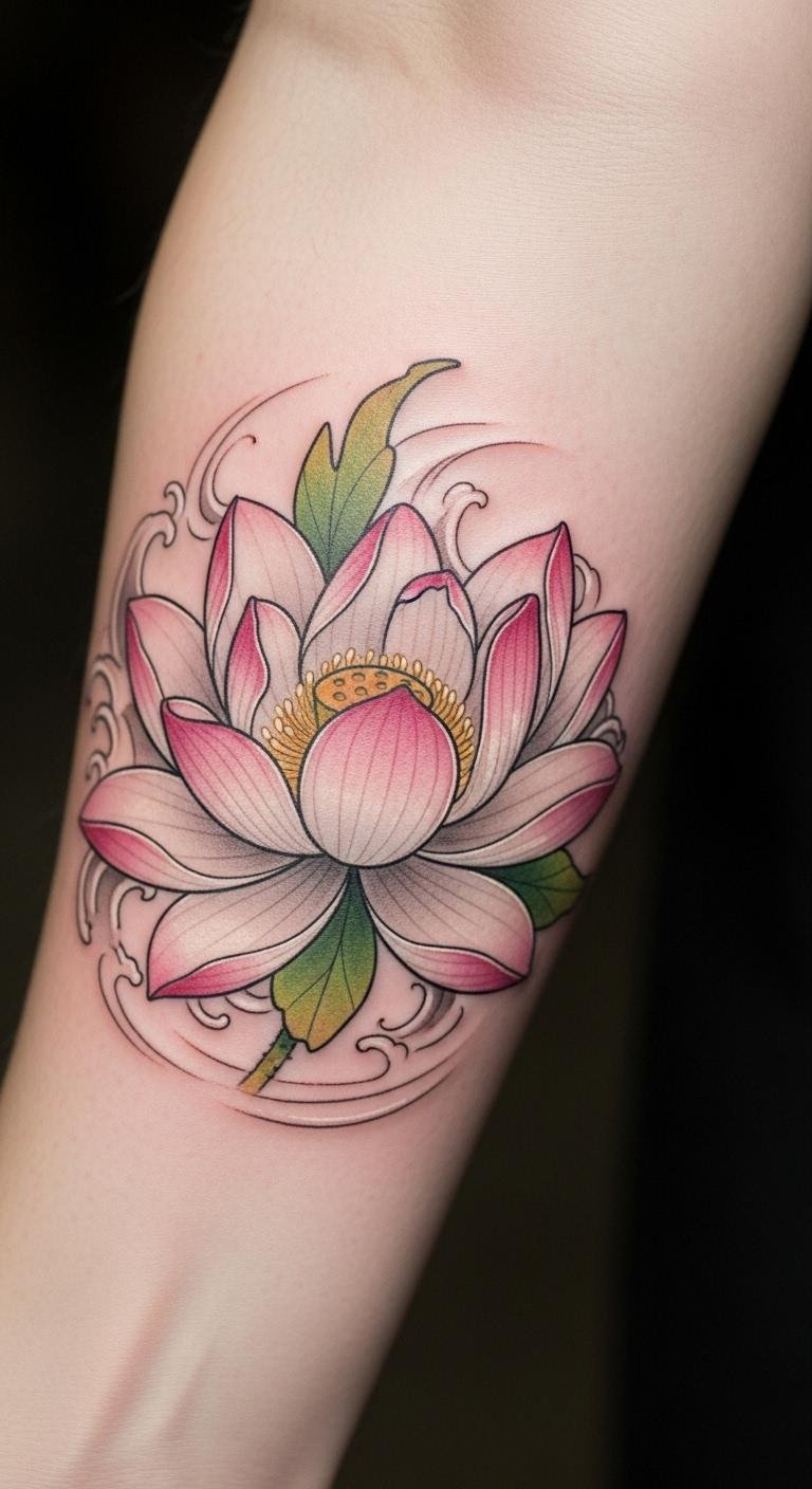 The lotus flower tattoo symbolizes resilience and growth through adversity, embodying the journey of overcoming life’s challenges.