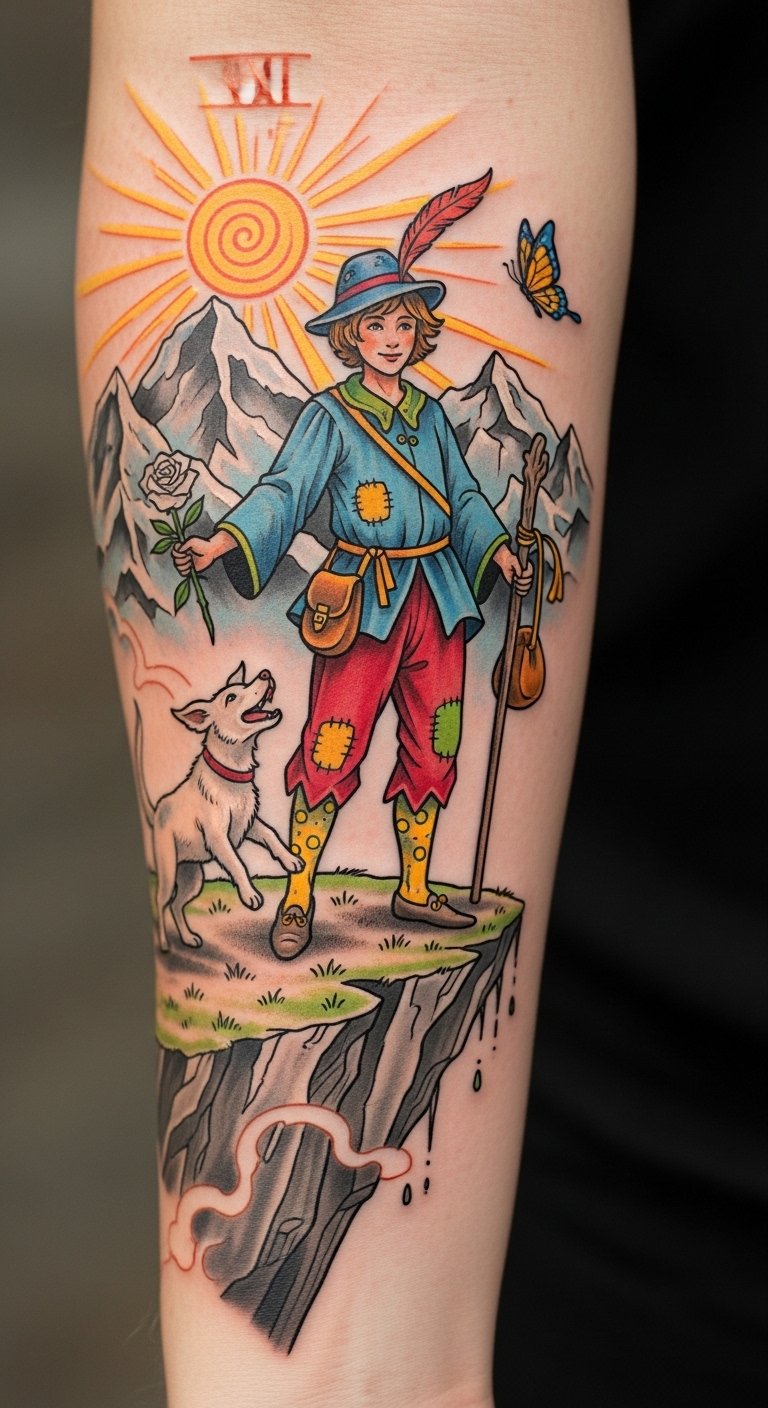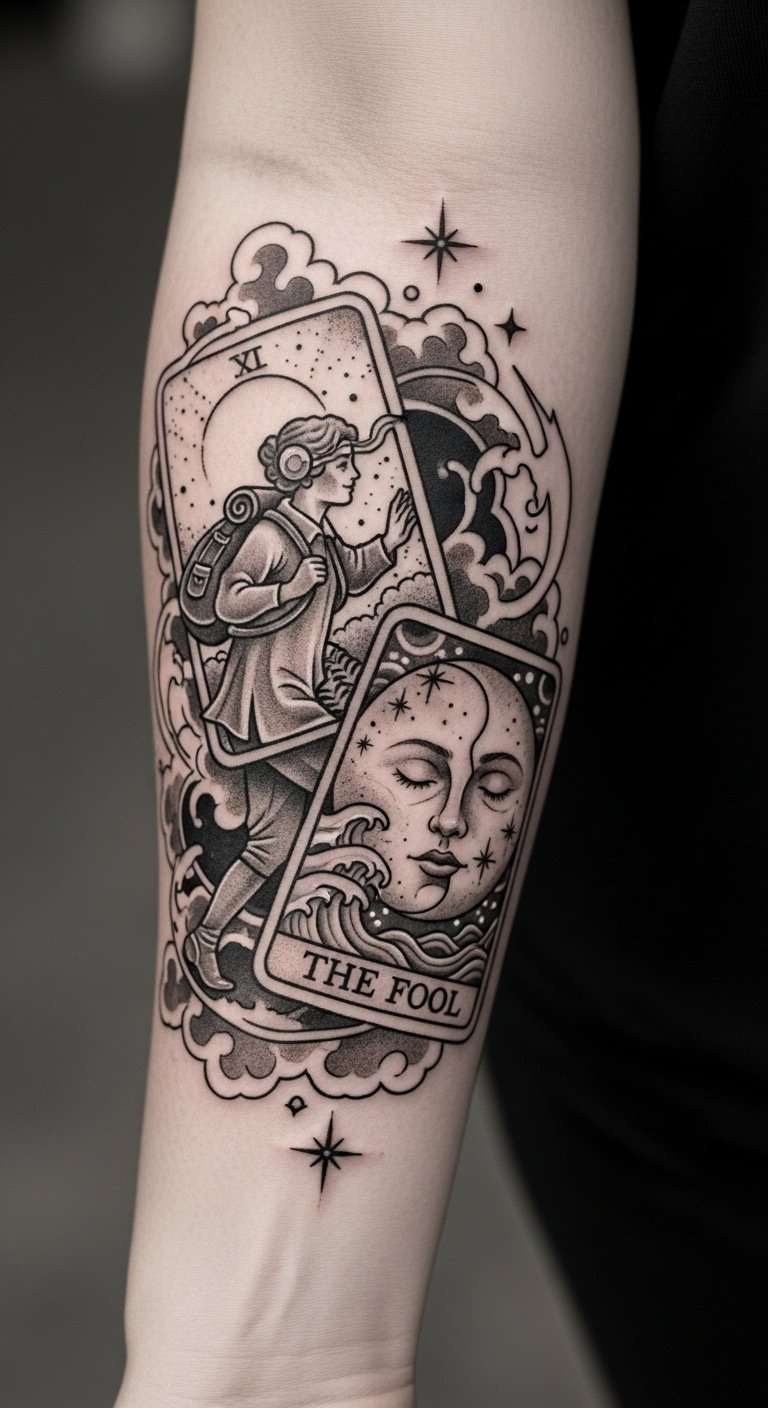 The Fool character represents the willingness to embrace change and invite new experiences into one’s life. Positioned on the forearm, it serves as a daily reminder to take leaps of faith and trust in the journey ahead, capturing the essence of living life boldly and authentically.