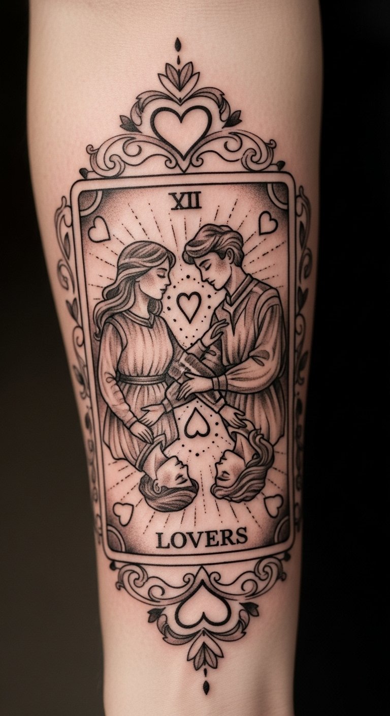 The Lovers tarot card tattoo symbolizes the power of relationships and the deep emotional bonds that connect us.