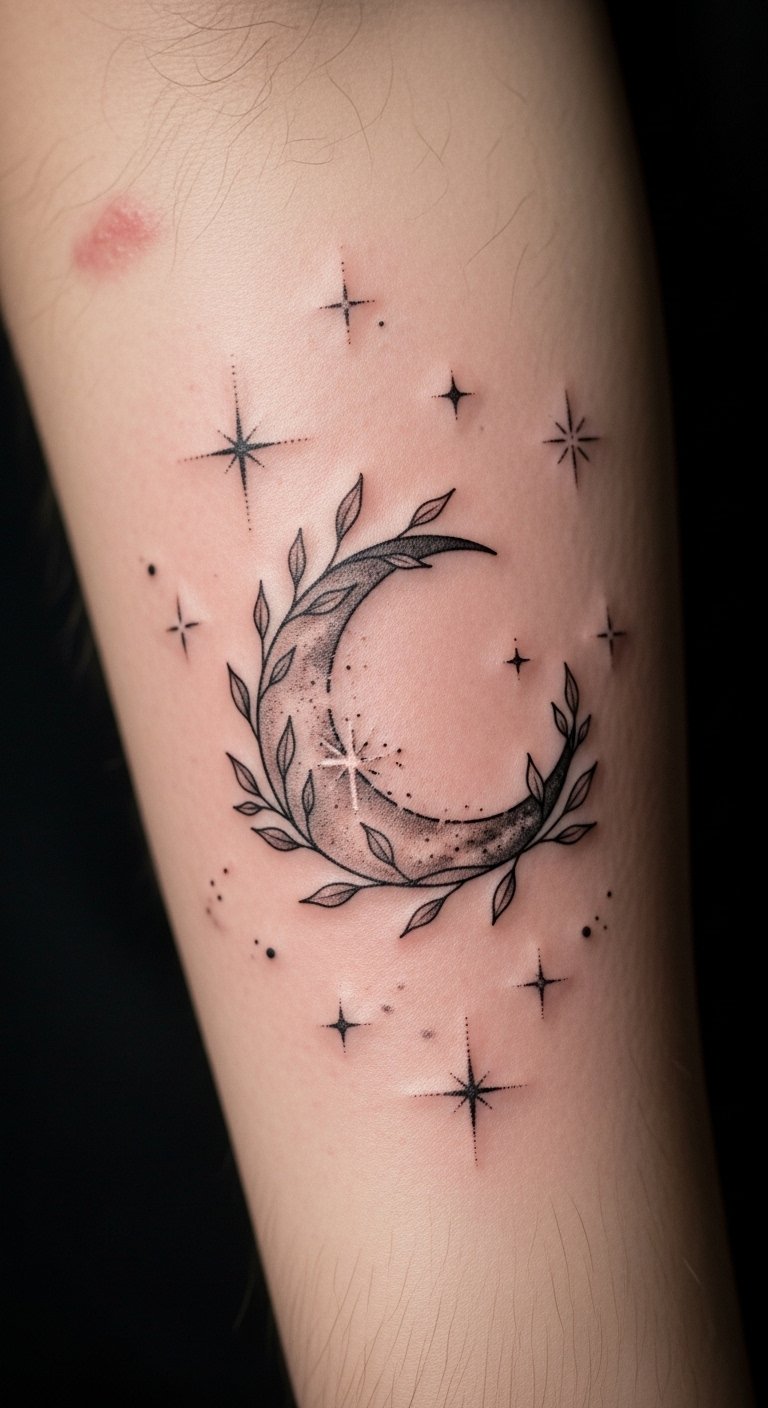 This tattoo design symbolizes the journey of self-discovery and intuition, with the crescent moon representing growth and new beginnings.