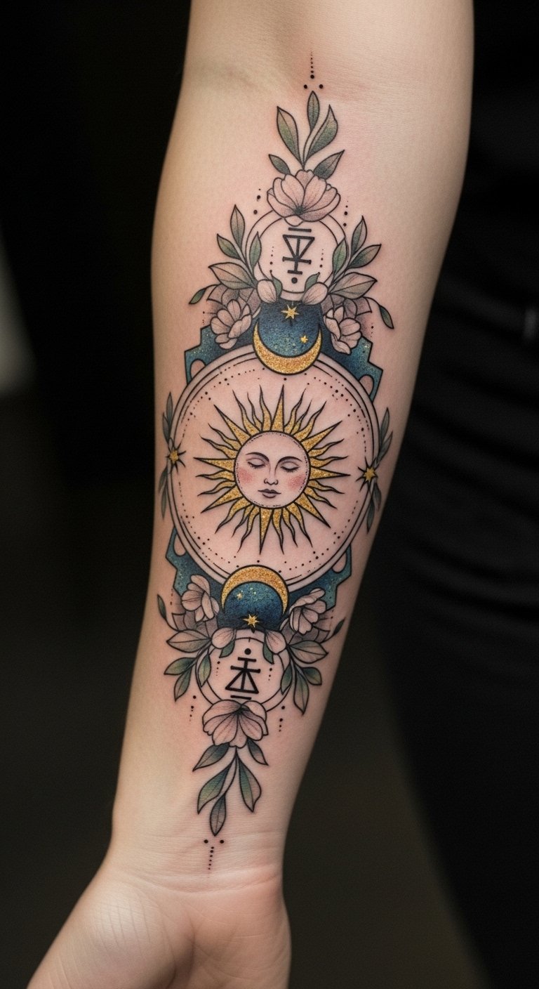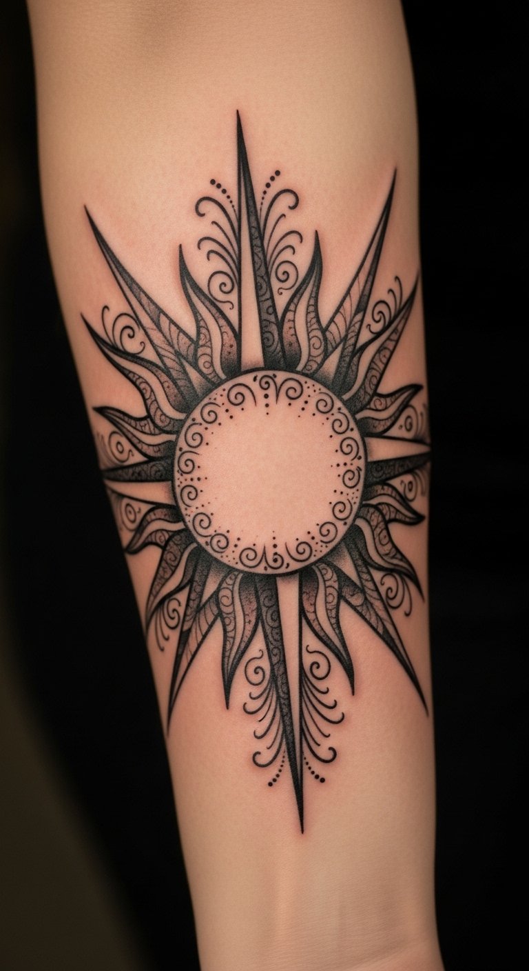 Placed on the forearm, it serves as a daily reminder to celebrate life’s beautiful moments. The radiant energy of the sun encourages self-empowerment and the embrace of one’s inner light, making it a perfect design for someone who wants to shine unapologetically in their journey toward happiness and fulfillment.