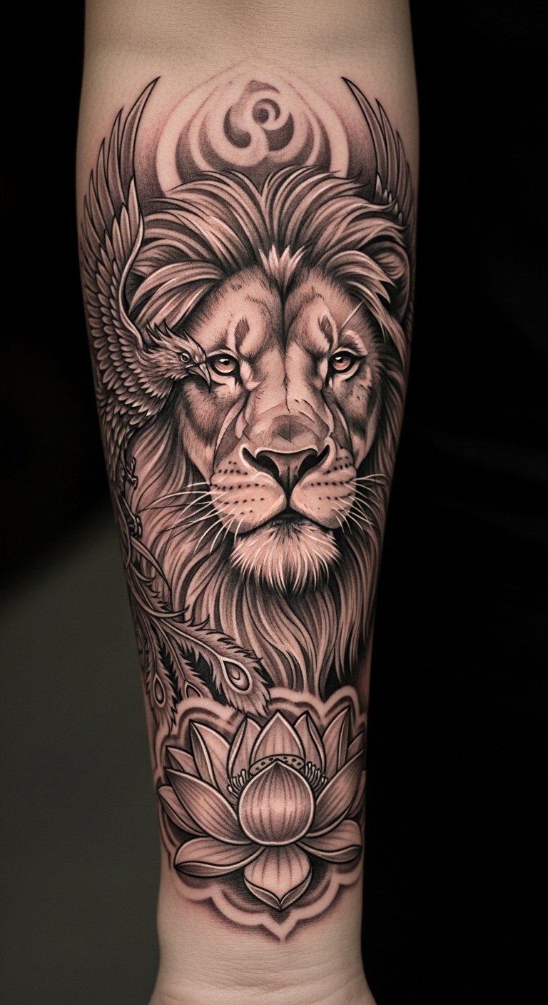 The lion’s head represents inner strength and courage, while the phoenix symbolizes rebirth and resilience in the face of adversity, and the lotus flower signifies purity and spiritual awakening.