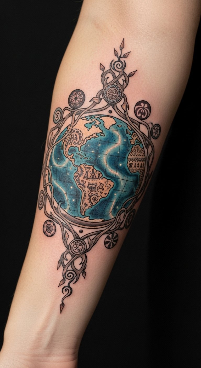 This tattoo design embodies the essence of The World card, symbolizing completion and global awareness. The globe signifies the journey of exploration and the diverse cultures that enrich our lives.
