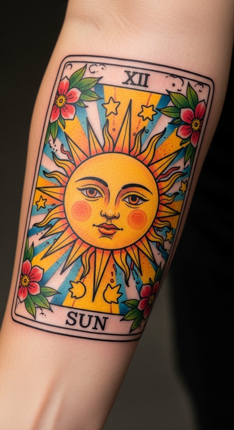 This tattoo symbolizes joy and positivity, embodying the essence of the Sun tarot card.