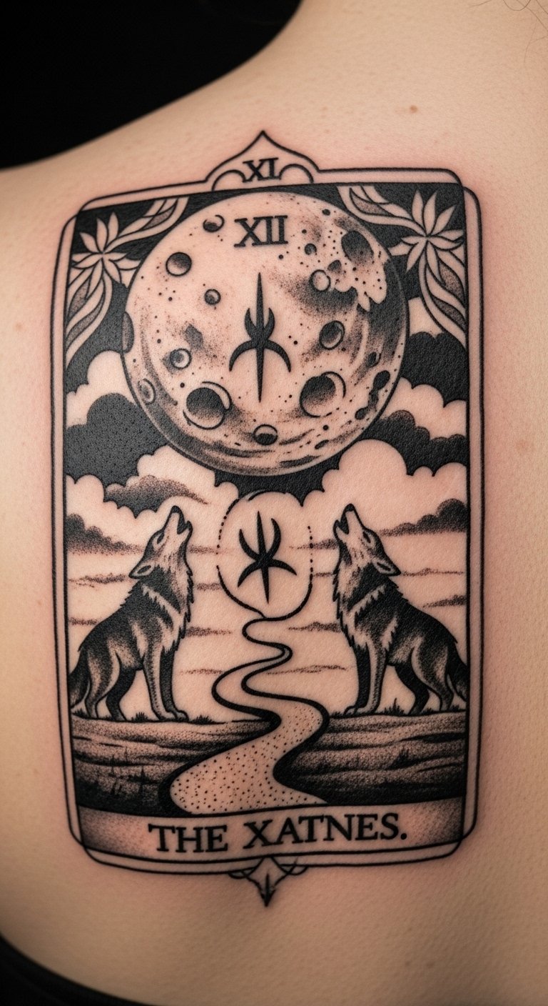 This tattoo embodies the themes of intuition, dreams, and the subconscious, as represented by The Moon card.