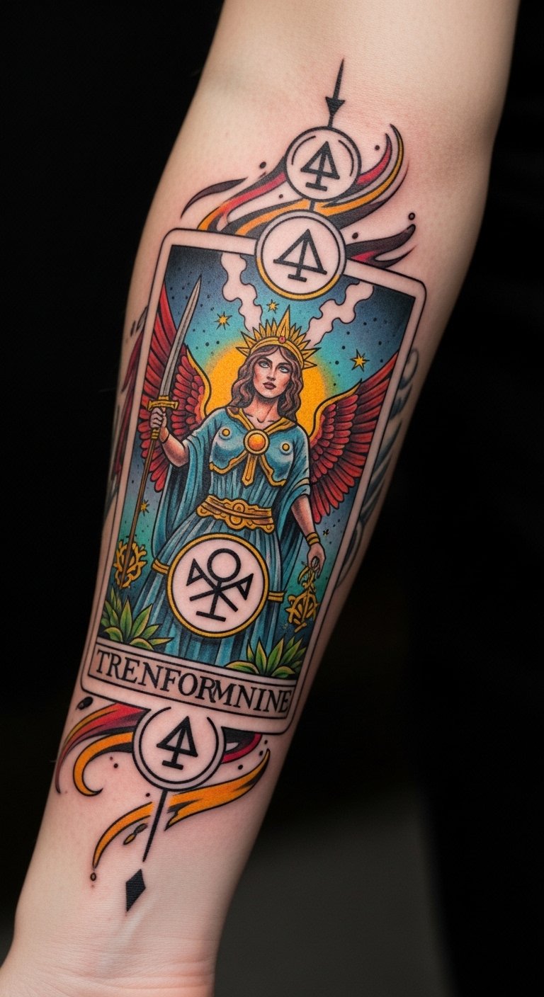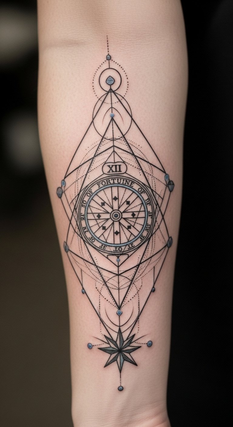 In this tattoo, the geometric elements symbolize the interconnectedness of life and fate, reflecting the themes of chance and hope inherent in tarot.
