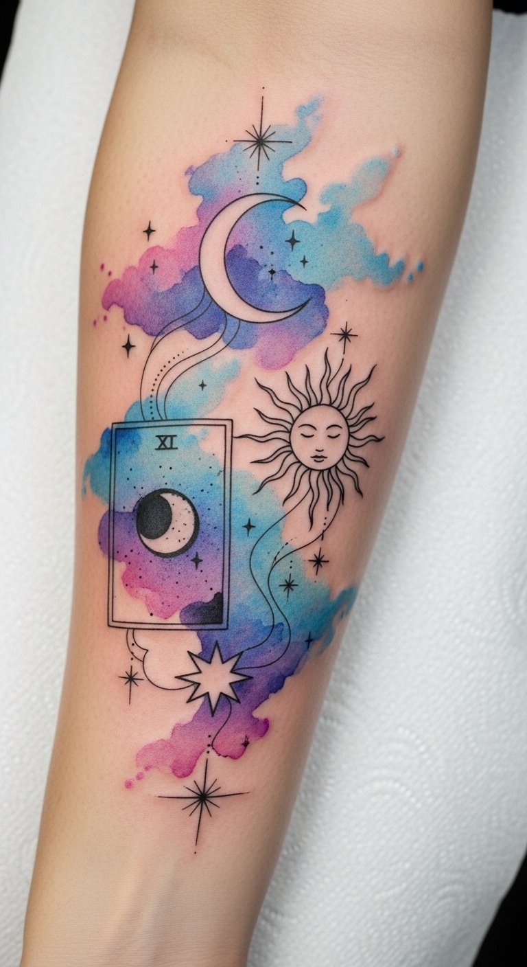 Each symbol serves as a reminder of one’s journey, celebrating the mystical and transformative power of personal growth, while the watercolor technique adds a whimsical touch, making the tattoo feel alive and connected to the wearer’s spirit.