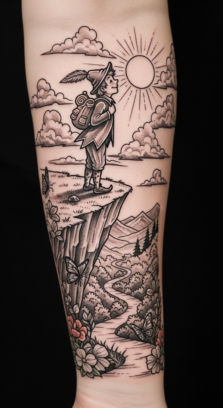 Positioned on the forearm, it symbolizes readiness to take risks and explore the unknown. The character’s playful demeanor alongside the dog reflects spontaneity and joy, while the cliff evokes the leap into the unknown.