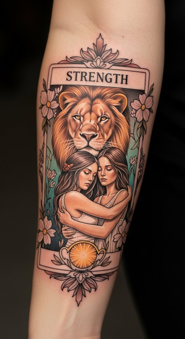 This tattoo symbolizes the essence of courage and inner strength, representing the balance between power and compassion. The lion embodies bravery, while the woman signifies emotional resilience, together illustrating the importance of facing life’s challenges with grace.