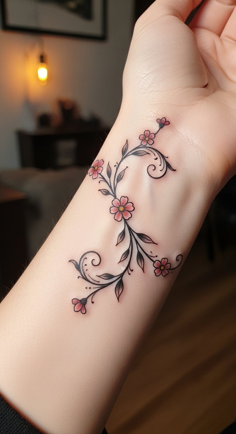 The vine’s fluidity suggests adaptability, while the flowers embody beauty arising from struggle, creating a deeply meaningful and intimate expression of one’s life story.