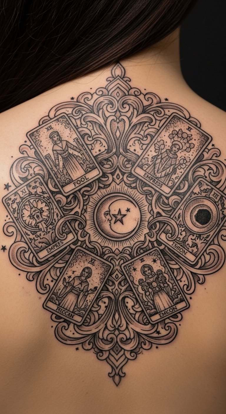 Placed on the upper back, it serves as a reminder of the wearer’s strength and resilience, while the combination of these tarot cards resonates deeply with themes of empowerment and spirituality.