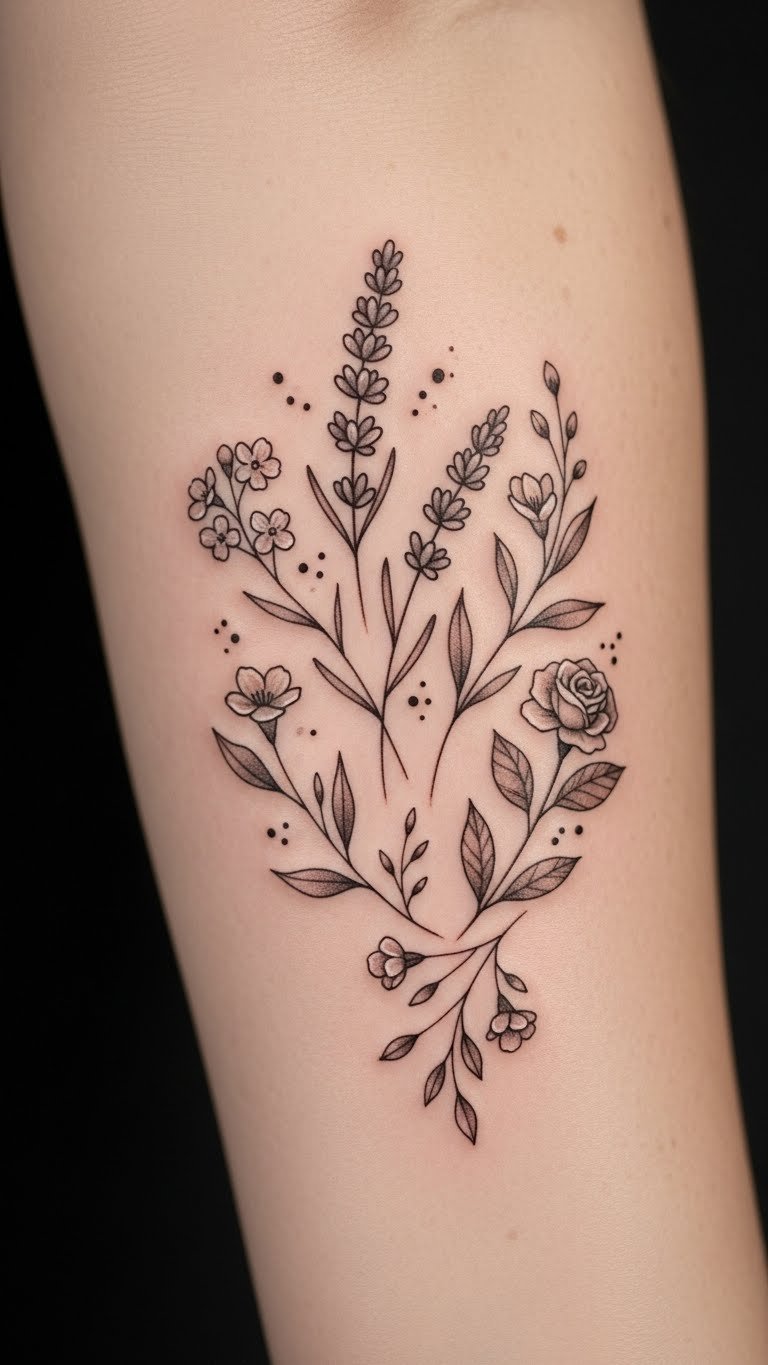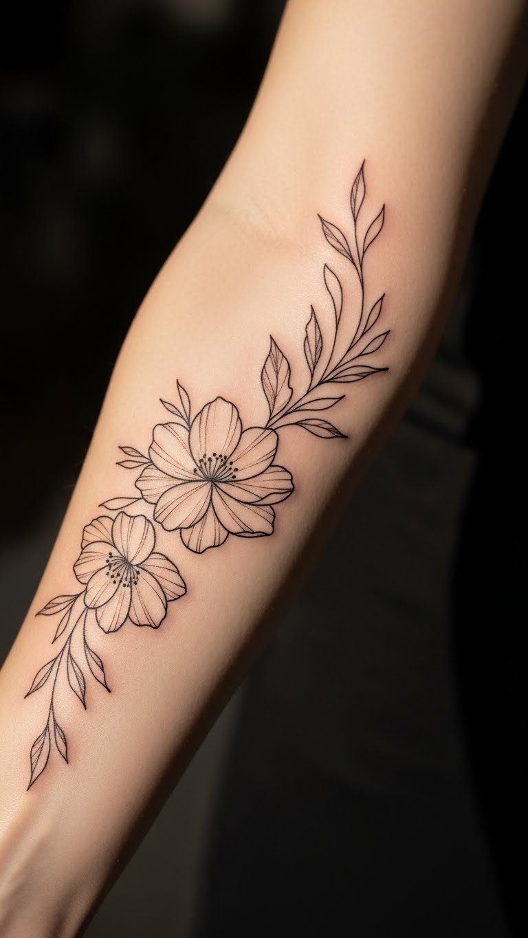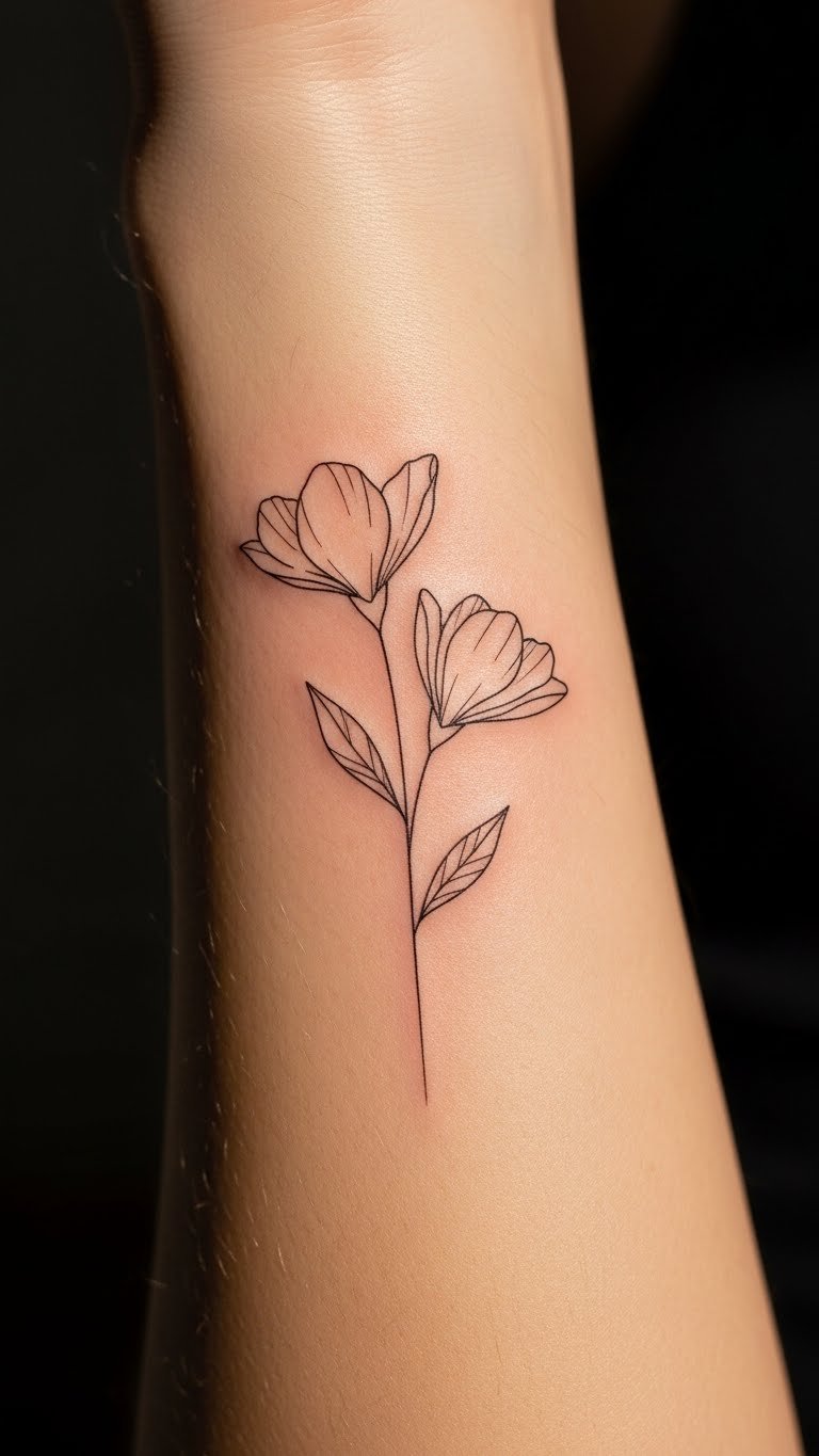 The floral design embodies freedom and creativity, inviting onlookers to appreciate the intricacies of life, while the fine line technique emphasizes the elegance found in simplicity.