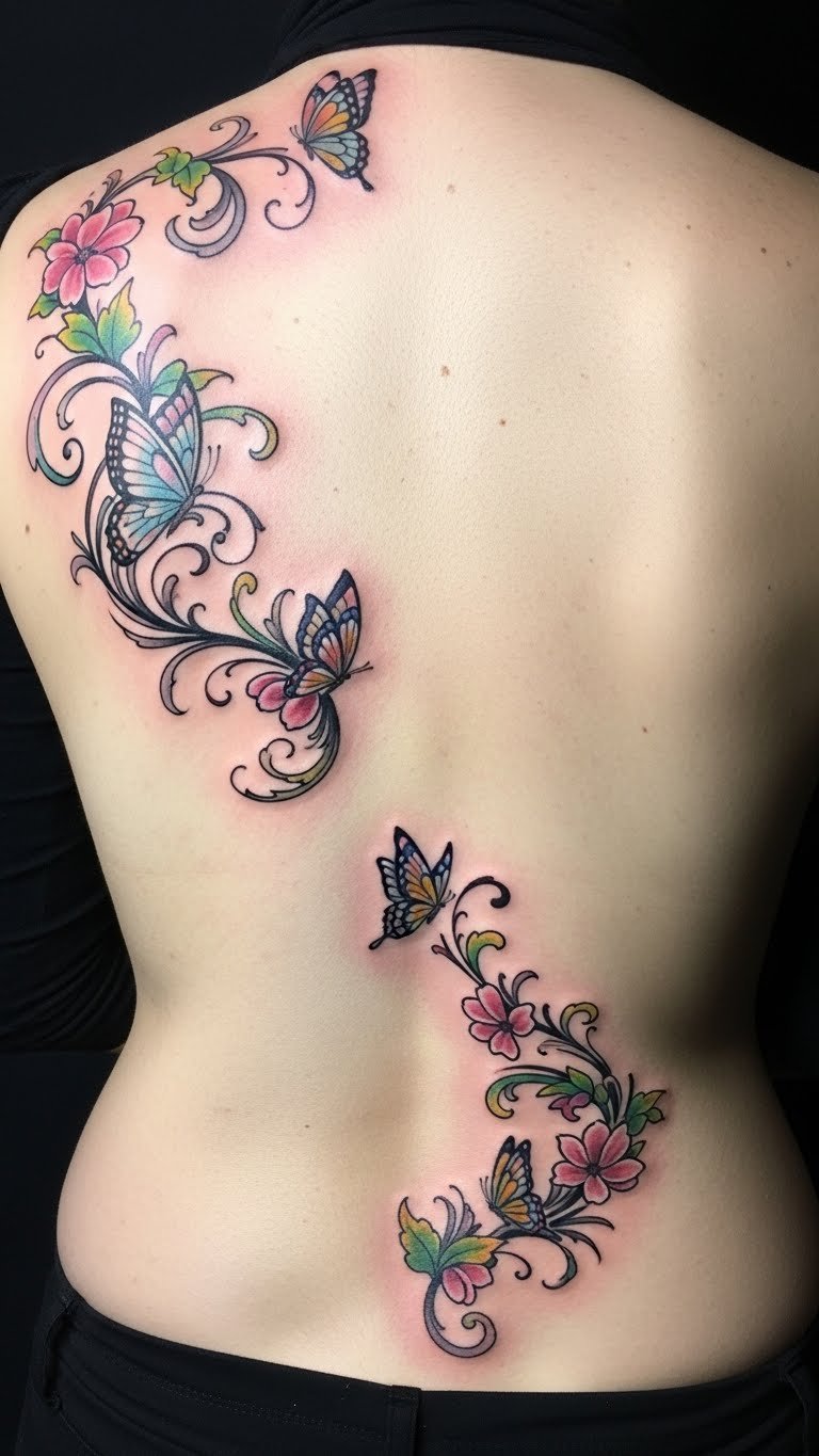 This tattoo design symbolizes the journey of self-discovery and empowerment, encapsulating freedom and feminine strength through its floral and butterfly motifs.