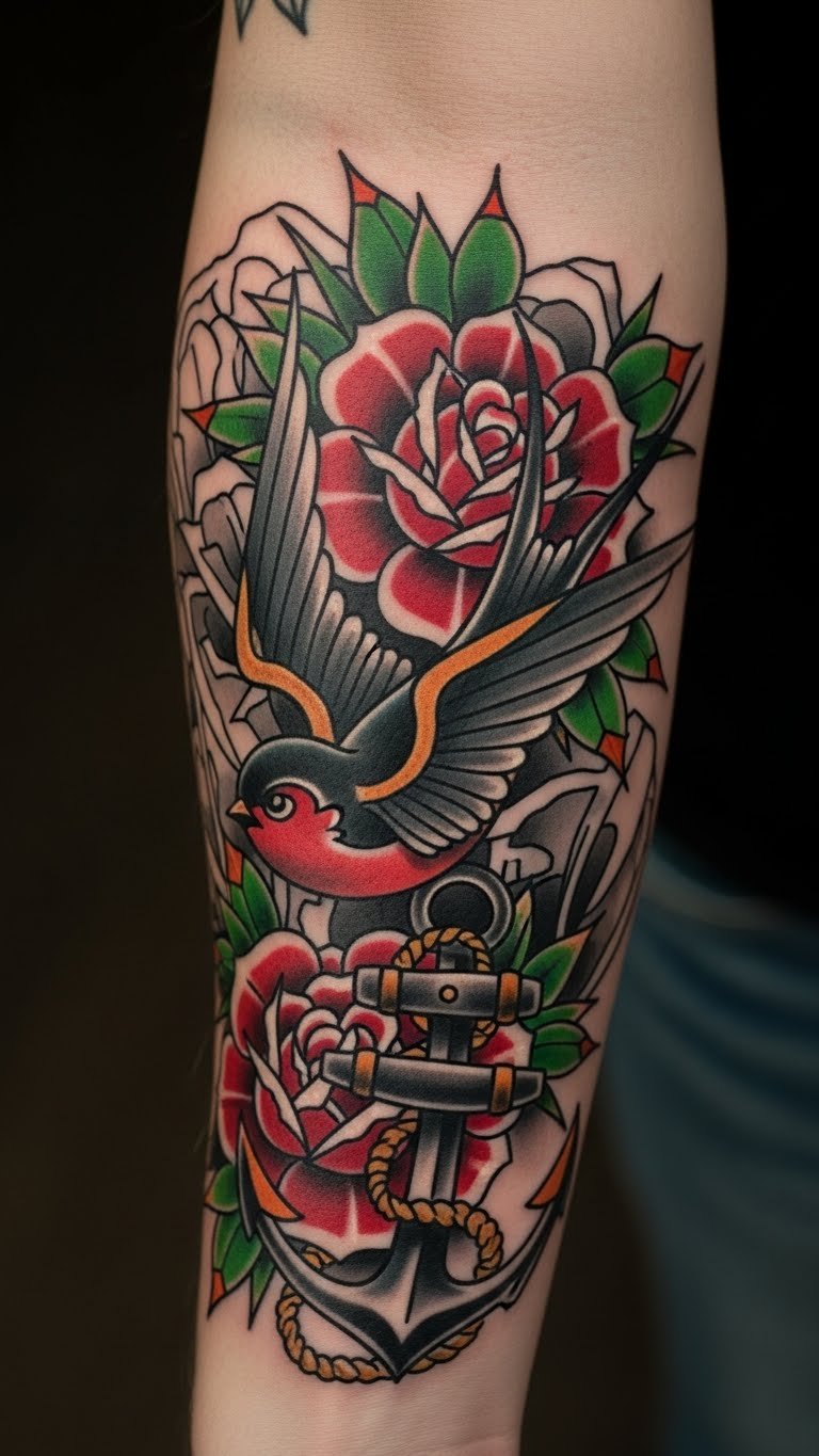 This design encapsulates themes of loyalty, love, and courage, embodied by the swallow representing safe travels, the roses symbolizing beauty and passion, and the anchor denoting steadfastness.