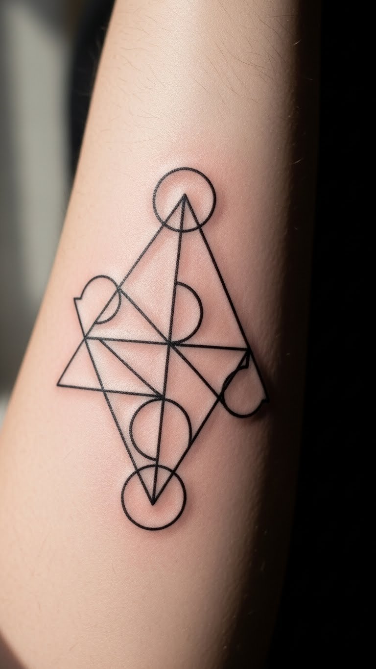 Positioned on the forearm, it serves as a constant reminder of the freedom that comes from minimalist design. The interlocking shapes symbolize unity and harmony, resonating with the individual’s journey toward self-discovery and personal growth.