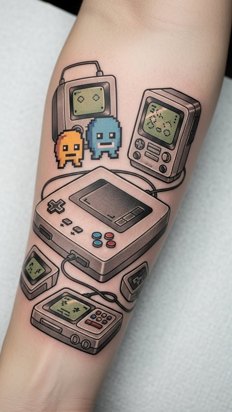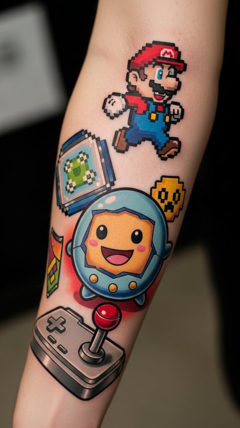Each element serves as a reminder of the carefree days spent immersed in pixelated worlds, making it not just a tattoo but a tribute to cherished moments in gaming history.