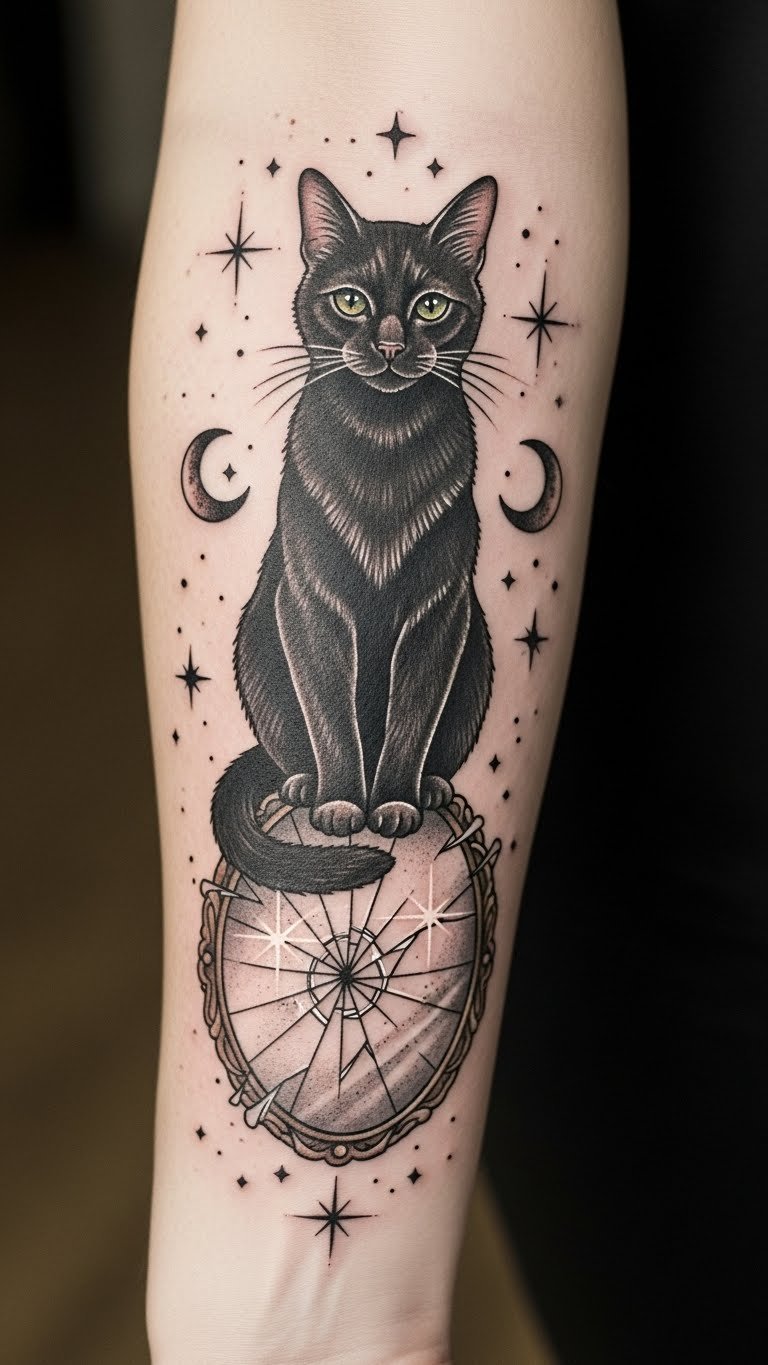 The black cat symbolizes mystery and superstition, while the broken mirror represents the idea of shattered luck and reflections of past experiences.