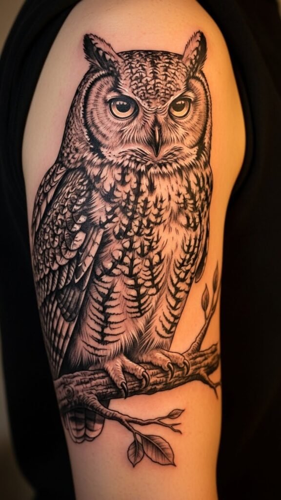 The owl’s watchful gaze reflects a sense of awareness and insight, while the natural placement on the upper arm signifies strength and resilience.